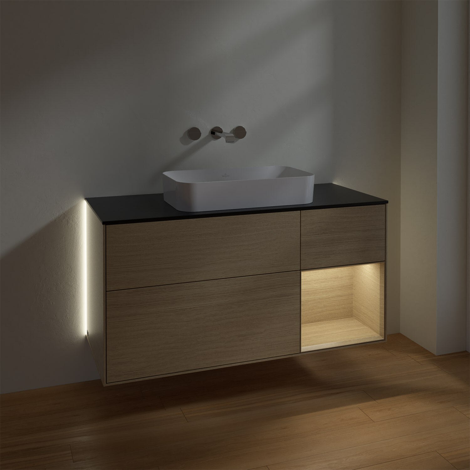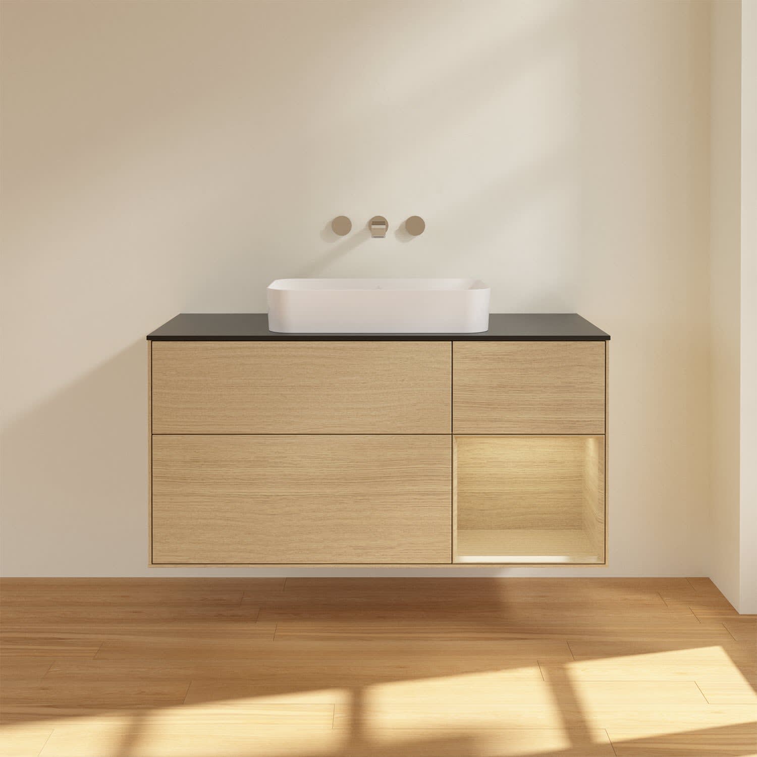 Villeroy & Boch Finion Waschtischunterschrank 120 cm mit Regalelement rechts und Abdeckplatte, mit Wandbeleuchtung
