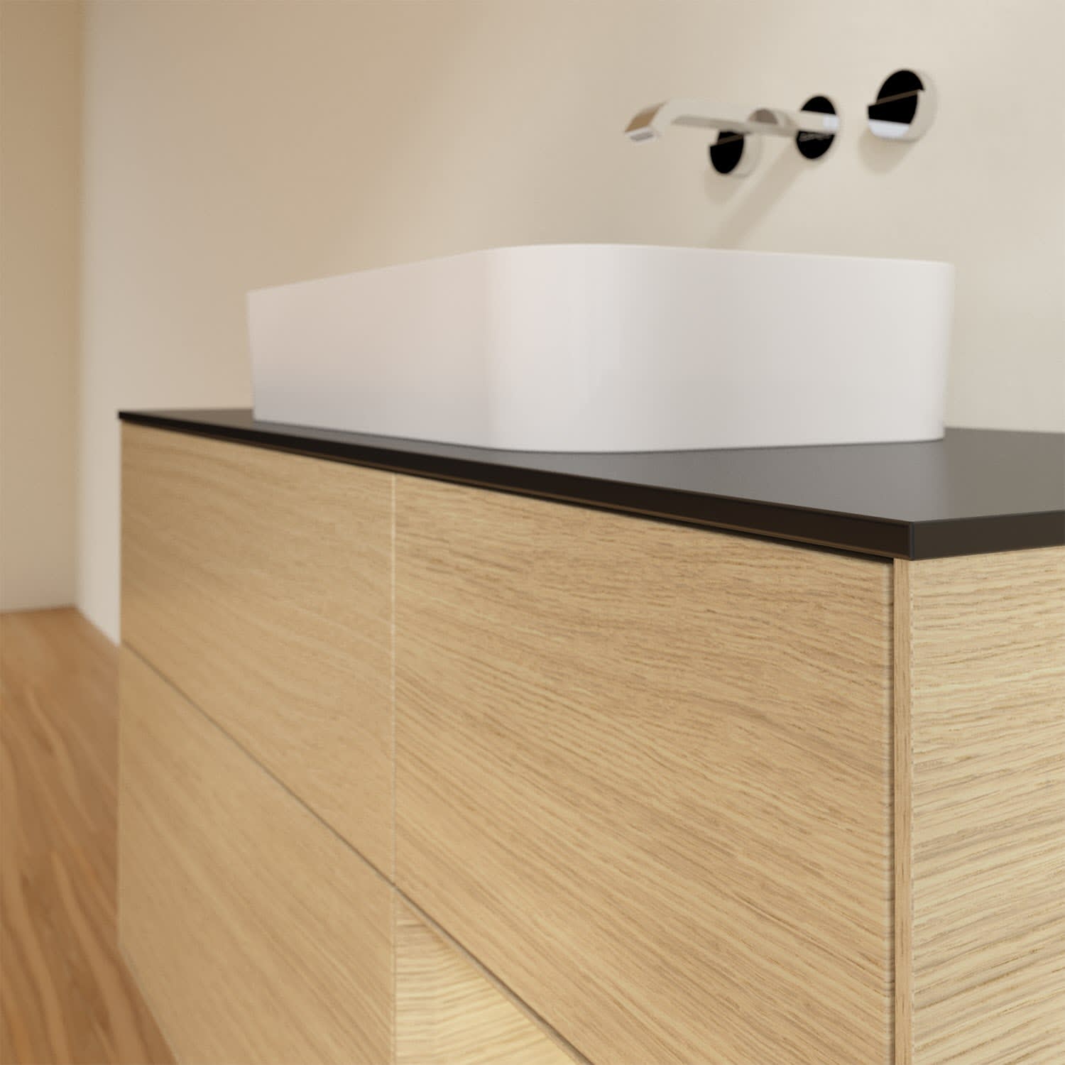 Ausdrucksstarkes Design und raffinierte Technik – der Finion Waschbeckenunterschrank von Villeroy & Boch punktet auf ganzer Linie. Dabei sorgt die stimmungsvolle, indirekte LED-Wandbeleuchtung sowie das beleuchtete Regalelement für ein behagliches Ambiente. Für allerlei Badutensilien gibt es genügend Stauraum in den drei großzügigen Auszügen mit rutschhemmenden Böden, verstellbaren Glasabtrennungen und Accessory Boxen. Die Auszüge lassen sich komfortabel durch leichten Druck öffnen und sie schließen dank Selbsteinzug langsam und leise. Noch mehr Ablagefläche für Seife, Zahnputzbecher und Co. bietet die Abdeckplatte. Für eine hochwertige Beschaffenheit und Optik des Möbels sorgt die mehrschichtig lackierte Oberfläche.