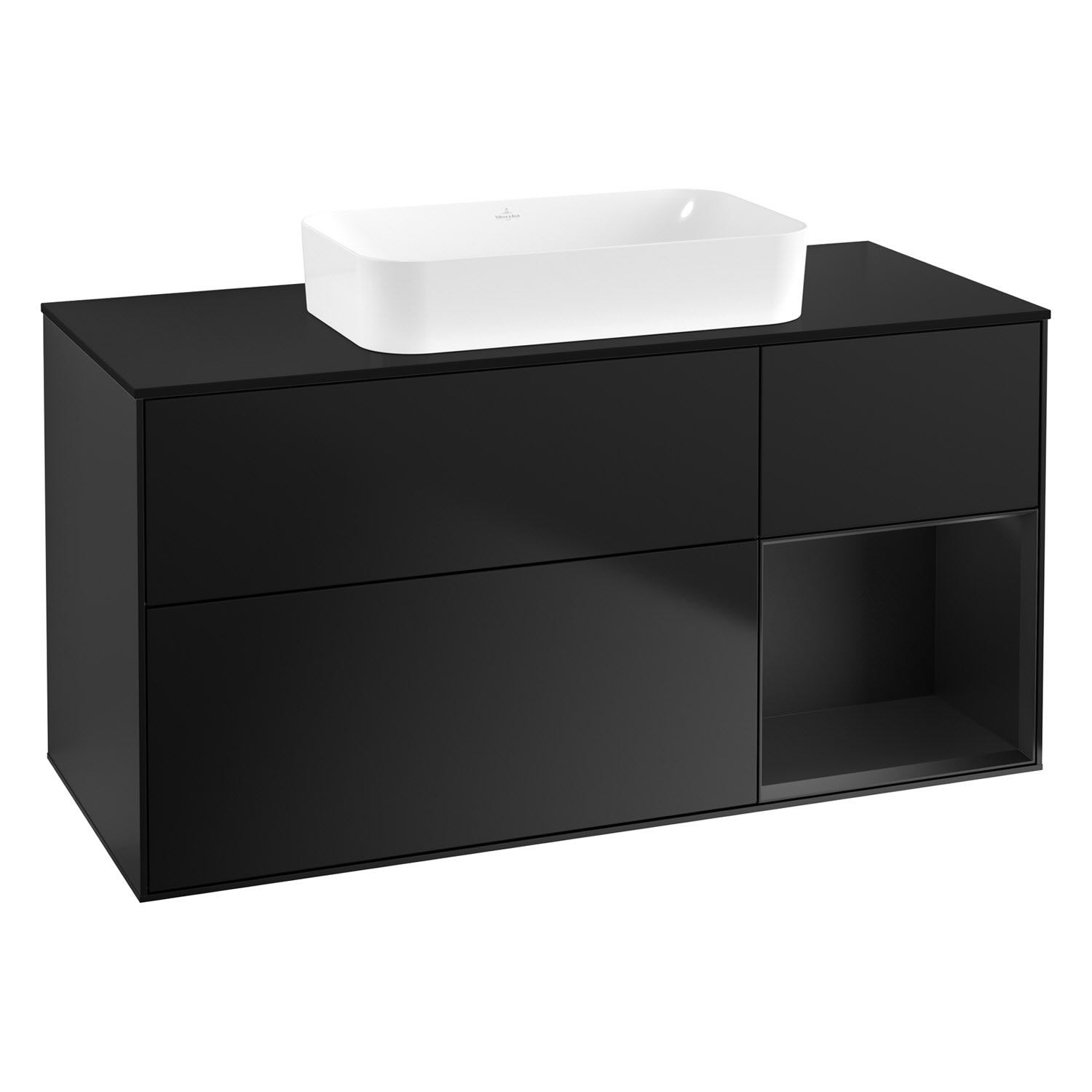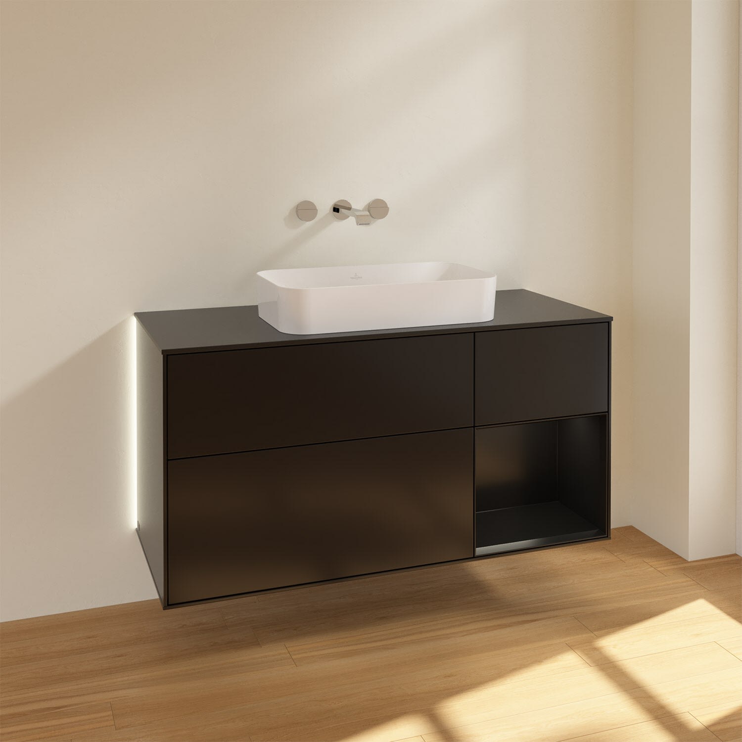 Villeroy & Boch Finion Waschtischunterschrank 120 cm mit Regalelement rechts und Abdeckplatte, mit Wandbeleuchtung