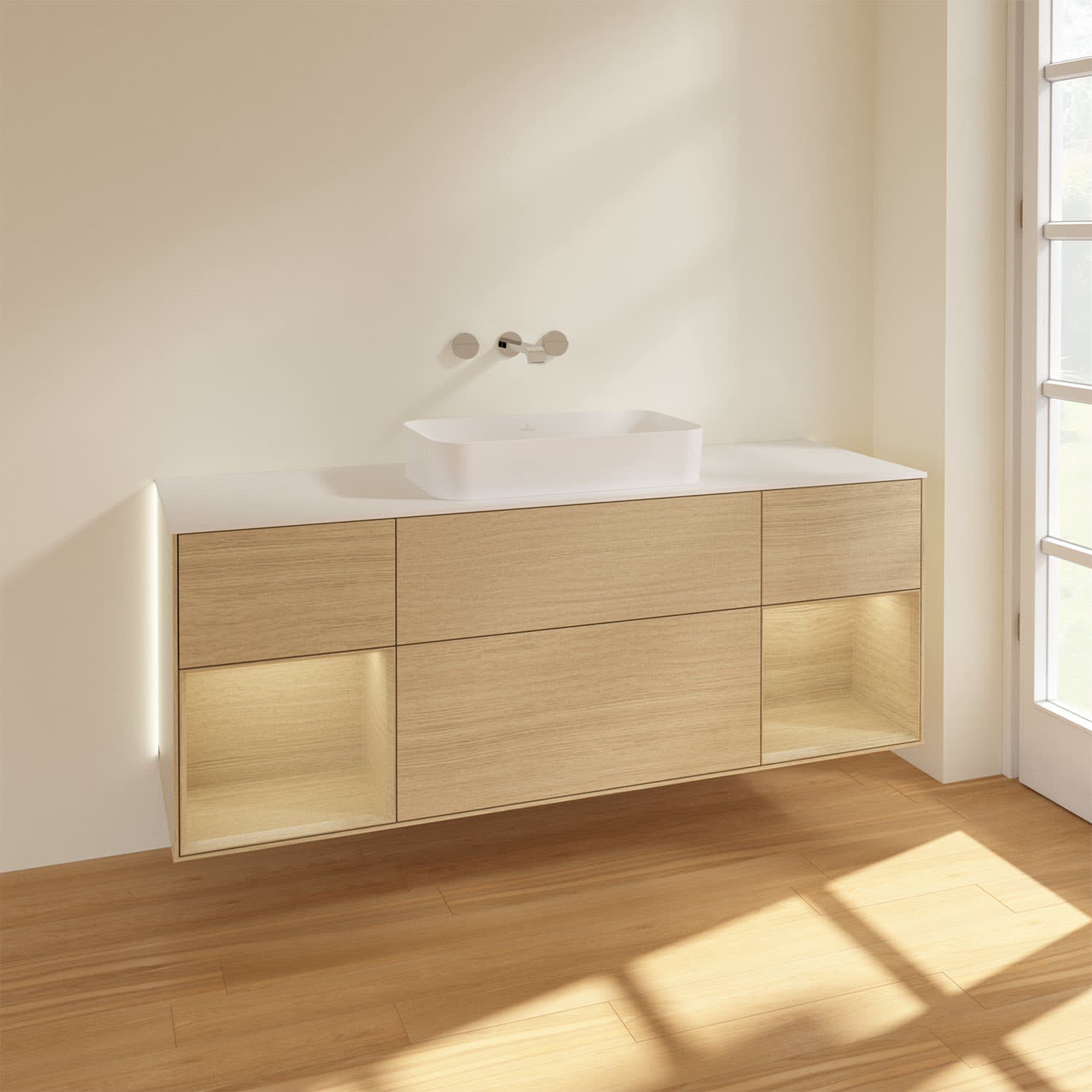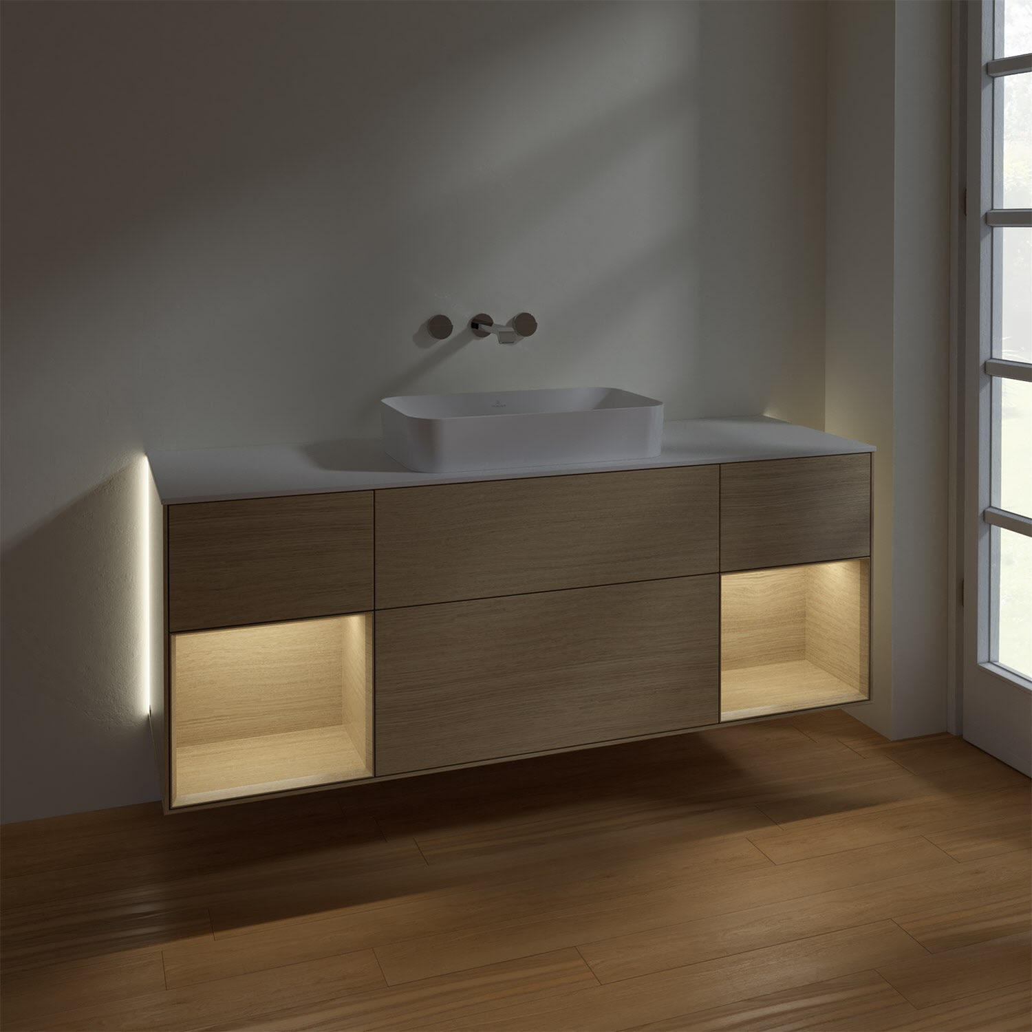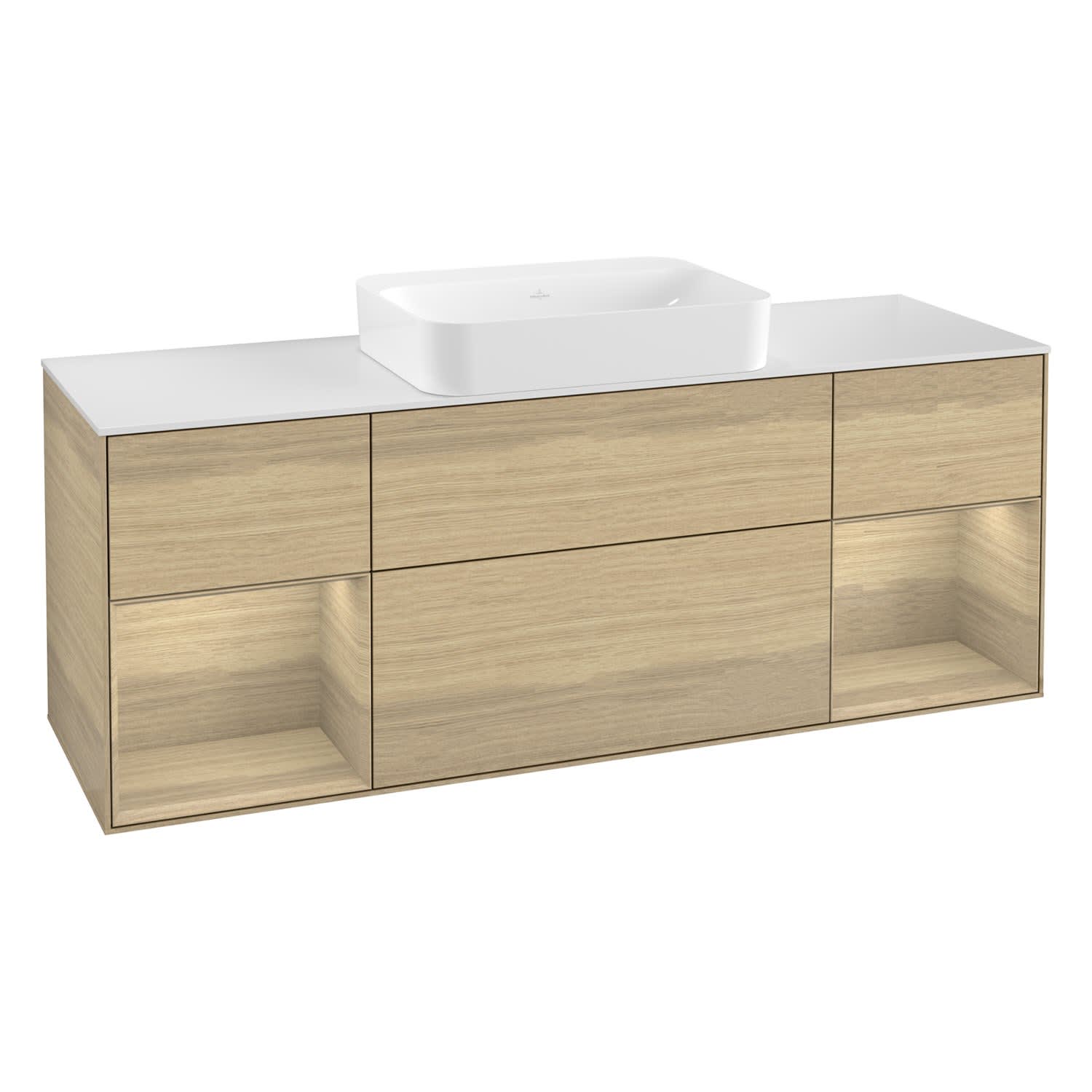 Villeroy & Boch Finion Waschtischunterschrank 160 cm mit Regalelement links und rechts und Abdeckplatte, mit Wandbeleuchtung