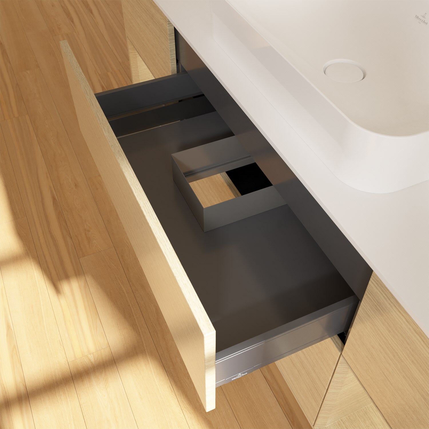 - kein Umfallen oder Verrutschen von Pflegeprodukten in den Schubladen dank rutschhemmendem Boden