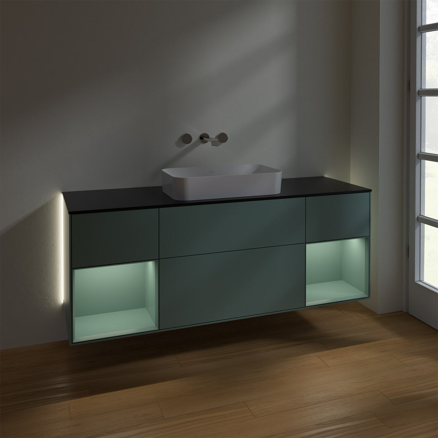 Villeroy & Boch Finion Waschtischunterschrank 160 cm mit Regalelement links und rechts und Abdeckplatte, mit Wandbeleuchtung