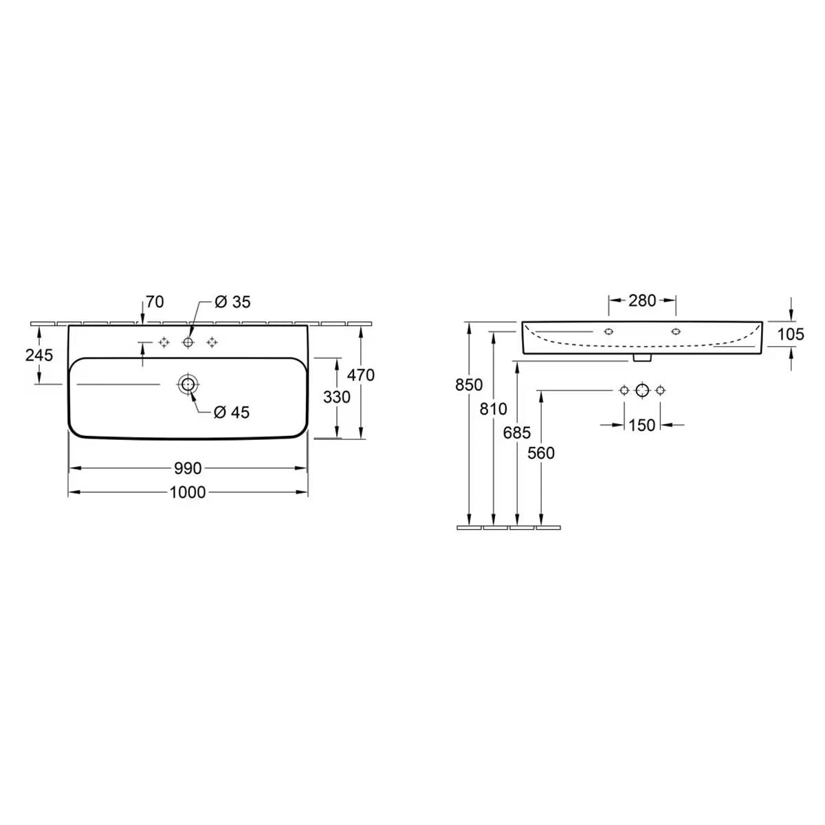 Villeroy & Boch Finion Waschtisch 100 cm mit 1 Hahnloch, ohne Überlauf