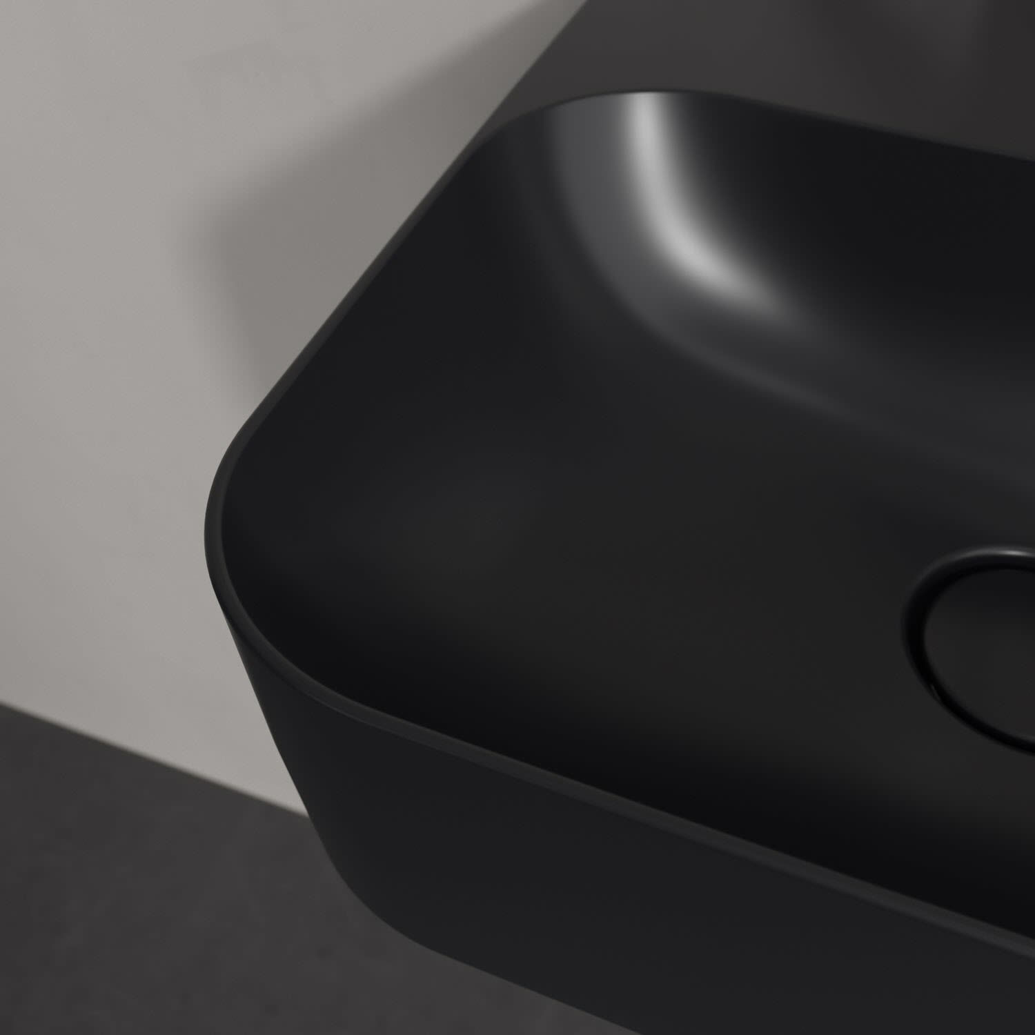 Das rechteckige Handwaschbecken der Kollektion Finion von Villeroy & Boch schafft mit seinen kompakten Maßen edlen Komfort vor allem in Gästebädern und kleinen Badezimmern. Extrem dünne Kanten mit außergewöhnlicher Festigkeit prägen den filigranen Charakter des Waschbeckens – ermöglicht durch den innovativen Werkstoff TitanCeram. Das flächenbündige, keramische Ablaufventil vervollständigt den edlen Look. Funktionell überzeugt das Waschbecken mit seinem großzügigen Becken für bequemes Händewaschen und der breiten Hahnlochbank, auf der die Seife ihren Platz findet. Für langanhaltende Sauberkeit sorgt die schmutzabweisende Oberfläche.