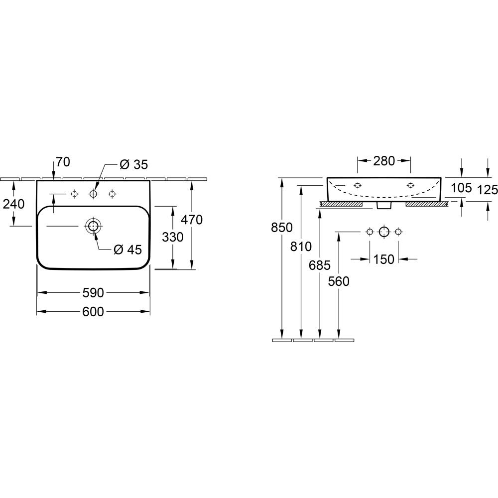 Villeroy & Boch Finion Aufsatzwaschtisch 60 x 47 cm mit Hahnloch, mit ViFlow Überlauf