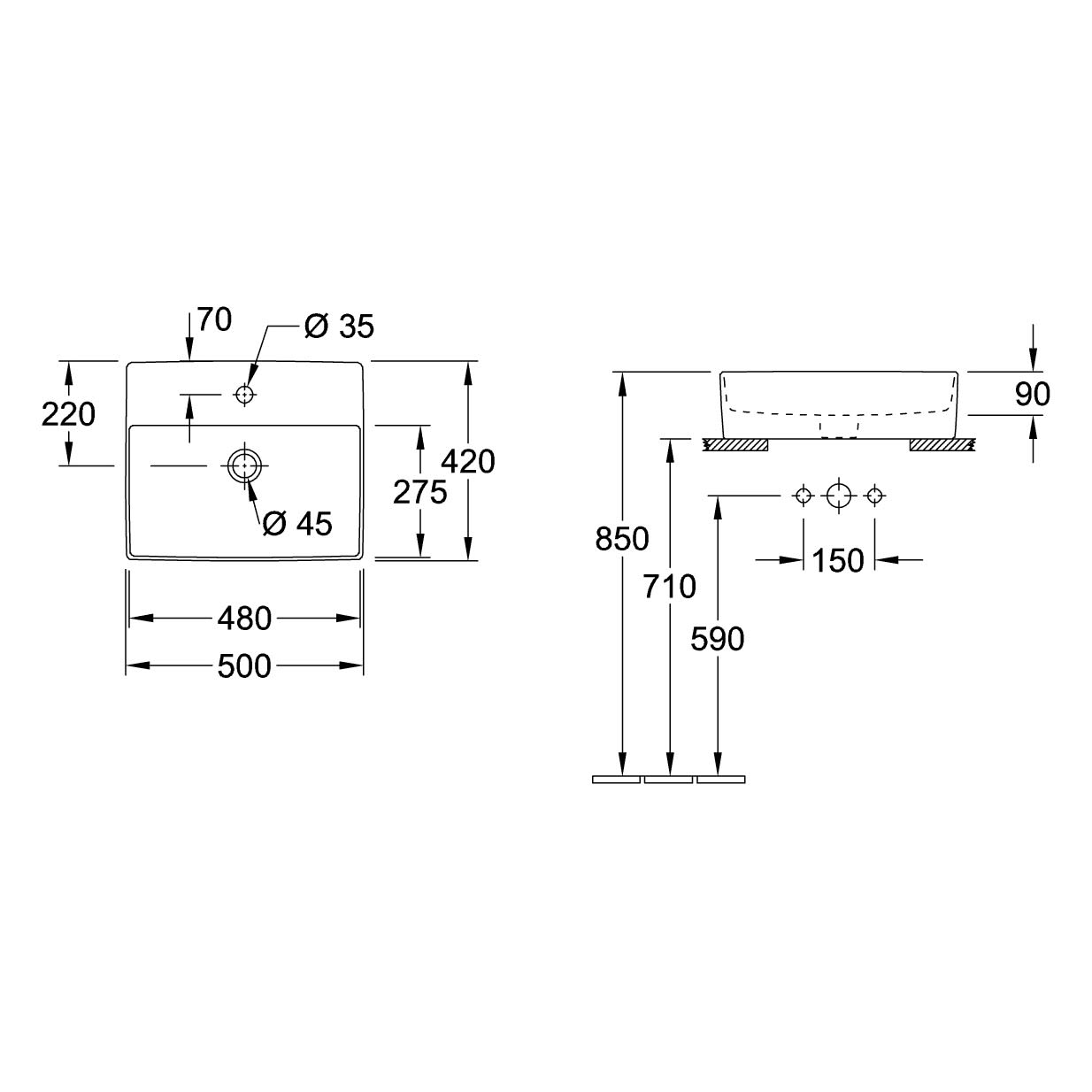- Empfehlung: Montage mit Mindestabstand zwischen Waschbeckenrückwand und Wand: 0,5 cm