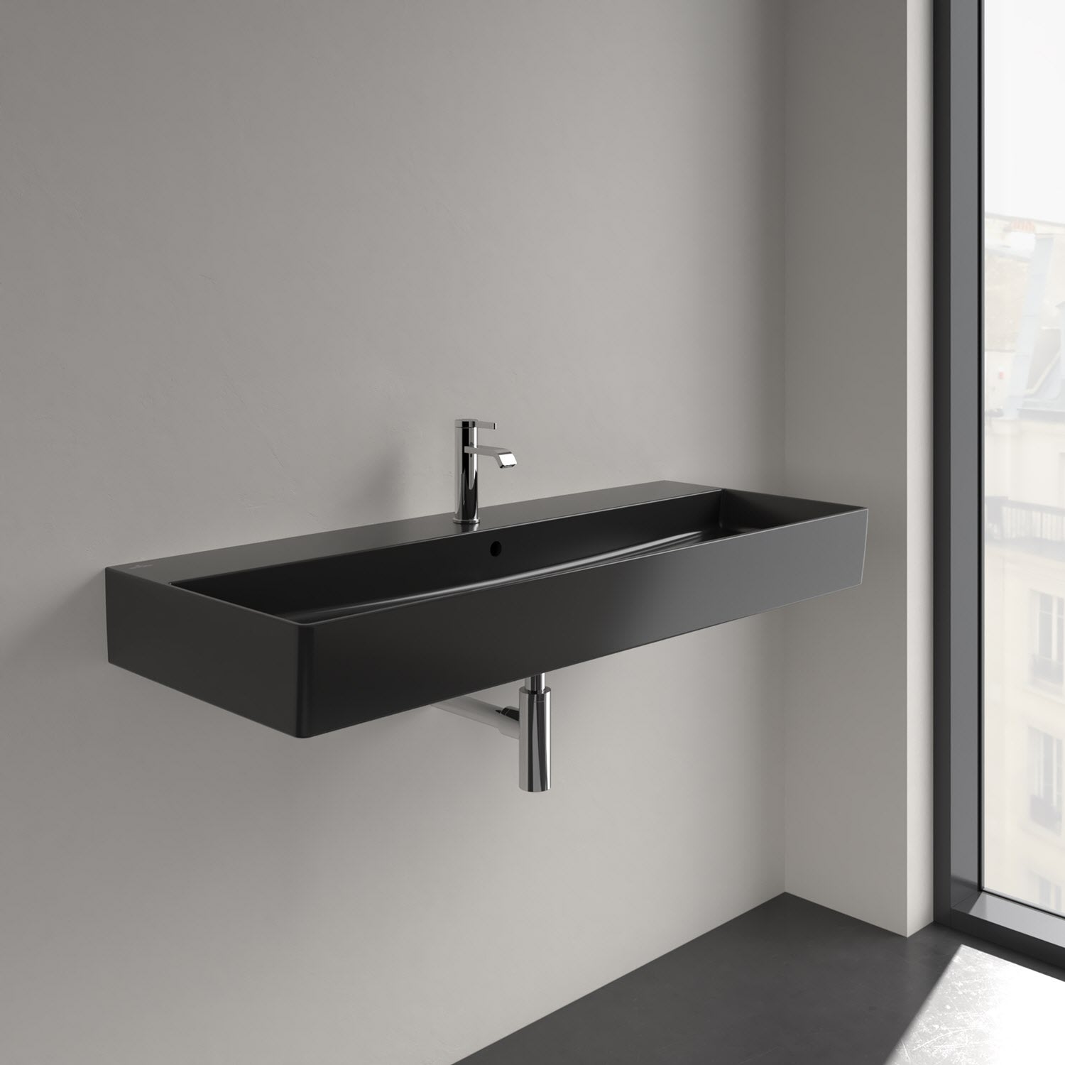 Das rechteckige Wandwaschbecken der Kollektion Memento 2.0 von Villeroy & Boch macht den Waschplatz zum wahren Blickfang im Badezimmer. Sein modernes Design erhält das Waschbecken dank des innovativen Werkstoffs TitanCeram, mit dem sehr dünne Wandstärken und präzise Konturen entstehen. Für eine komfortable Ablagefläche sorgt die breite, durchgehende Hahnlochbank. Dank spezieller Beschichtung ist die Keramikoberfläche sehr pflegeleicht und schmutzabweisend. Unverwechselbar und höchst funktional.