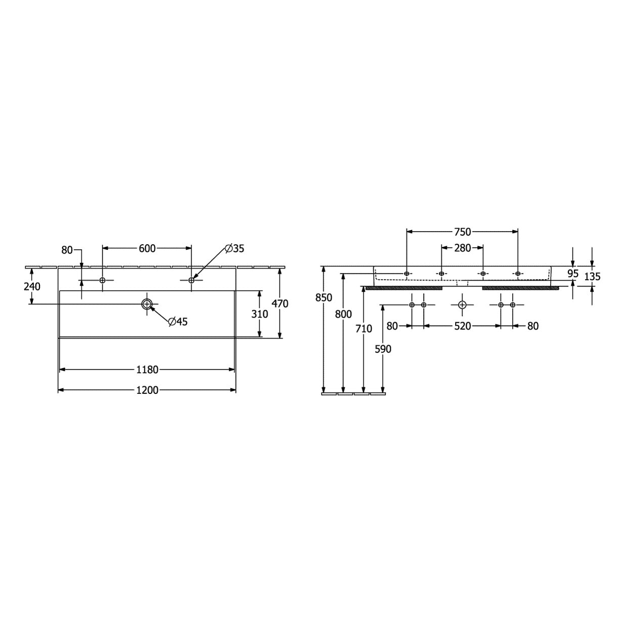 Villeroy & Boch Memento 2.0 Waschtisch 120 cm mit 2 Hahnlöchern, ohne Überlauf