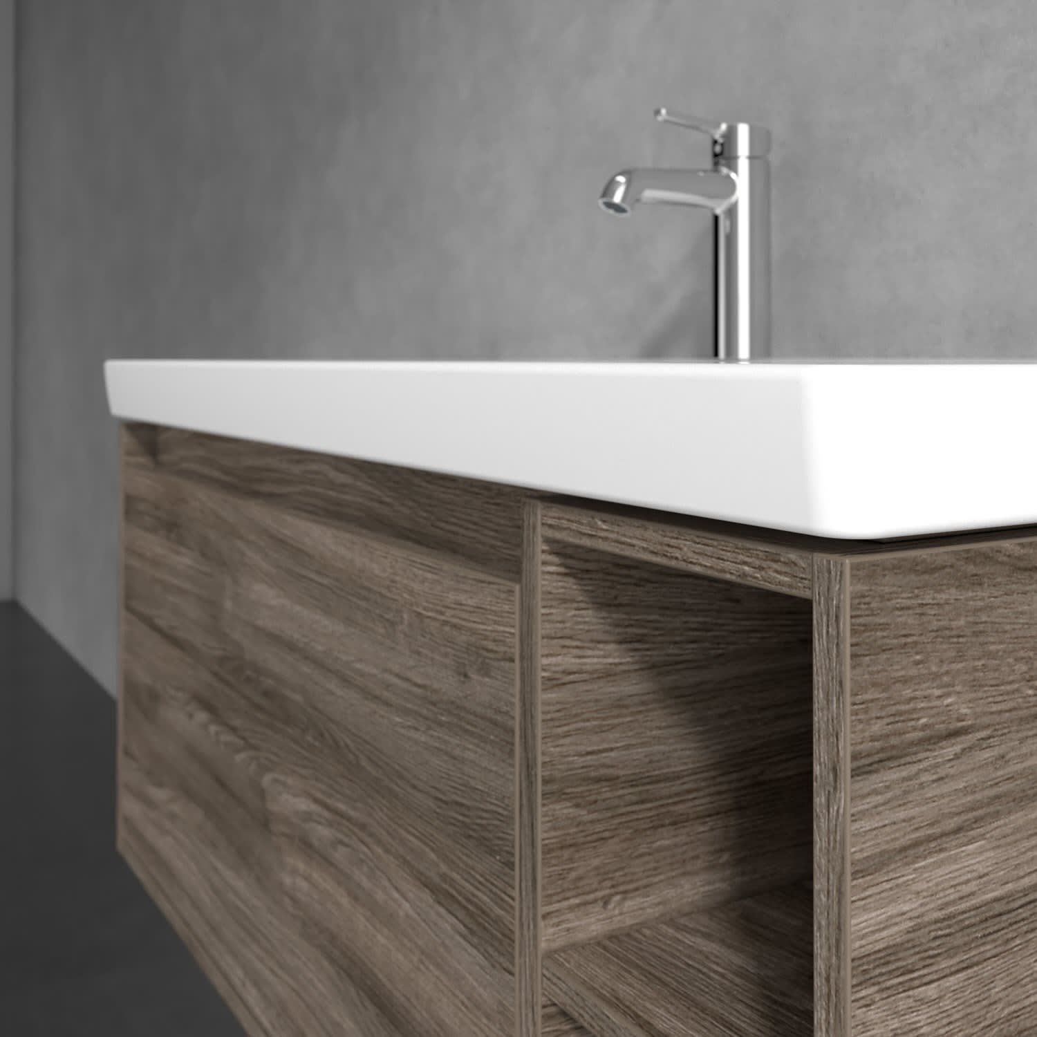 Die innenliegenden Fronten und Auszug mit Griffmulde sorgen für einen minimalistischen Look. Die voll ausziehbare Schublade bietet großzügigen Stauraum für Pflegeprodukte, Handtücher und mehr, während der rutschhemmende Boden für sicheren Halt sorgt. Der sanfte Selbsteinzugs-Mechanismus ermöglicht zudem leises und komfortables Schließen. Abgerundet wird das flexible Konzept durch die zusätzlichen offenen Stauraum-Fächer für weitere Utensilien.
