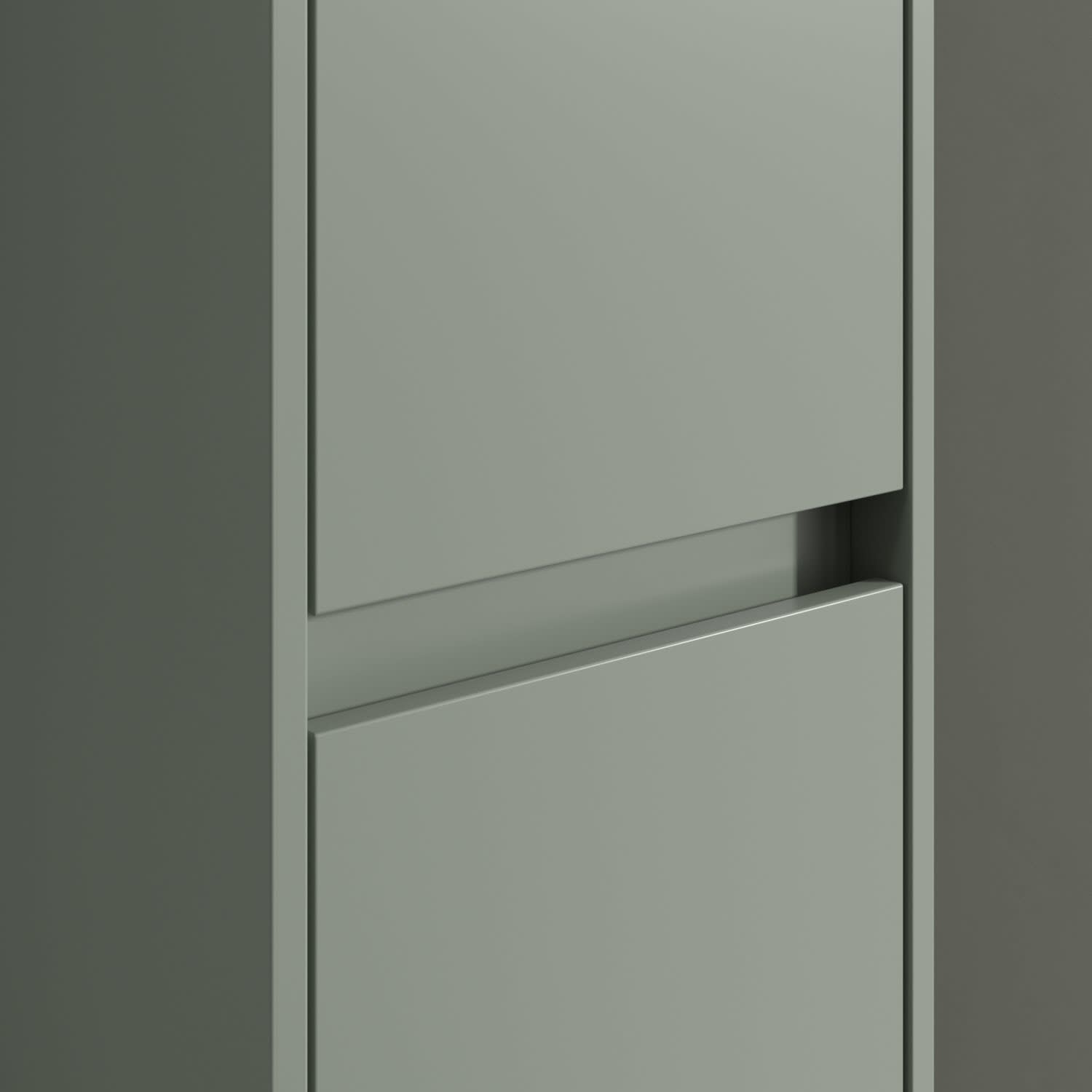 Zwei Türen mit Griffmulden und dezente Fronten unterstreichen das cleane Design. Dahinter sorgen hochwertige Glas-Einlegeböden für eine edle Optik und bieten gleichzeitig optimalen Stauraum für Pflegeprodukte, Handtücher und mehr.