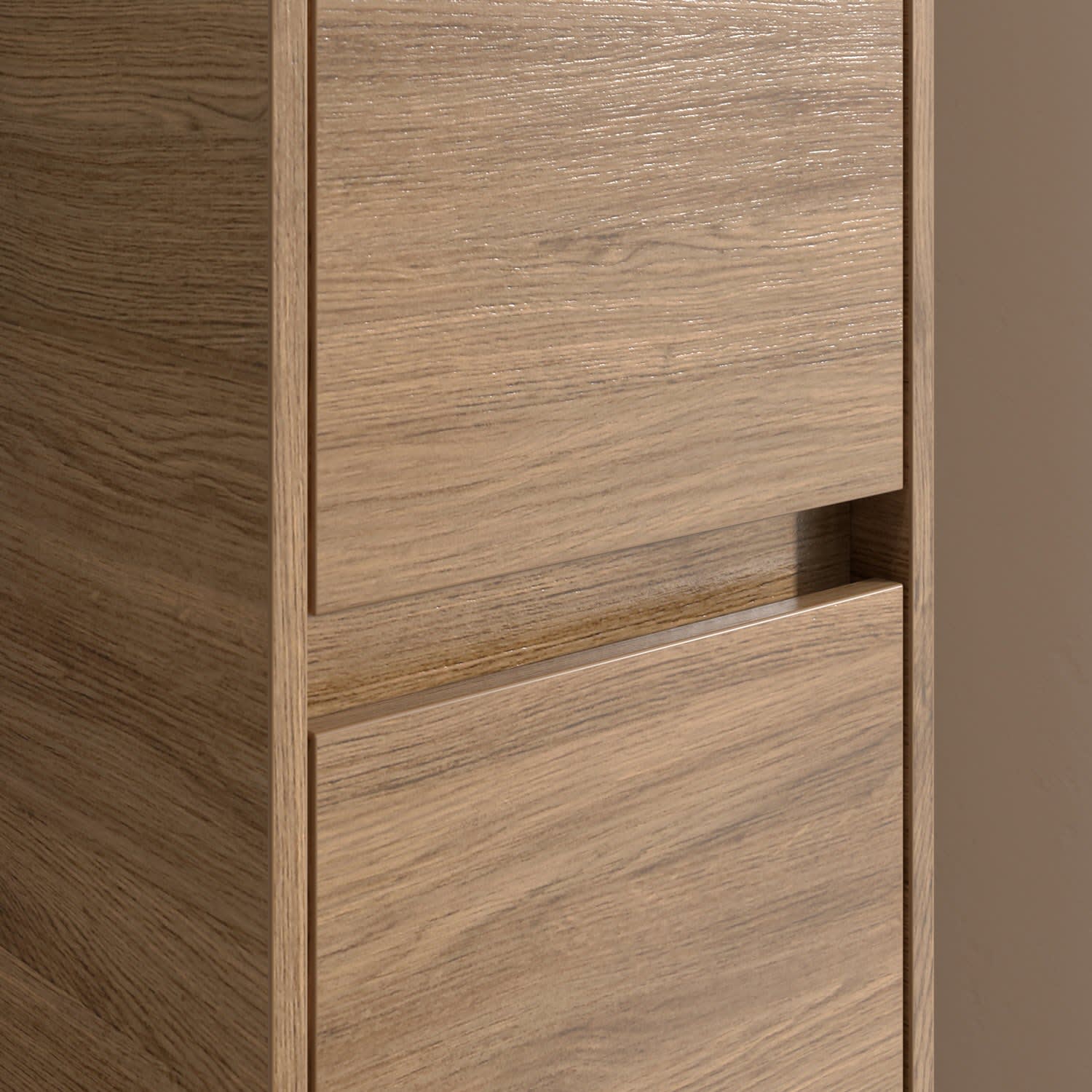 Zwei Türen mit Griffmulden und dezente Fronten unterstreichen das cleane Design. Dahinter sorgen hochwertige Glas-Einlegeböden für eine edle Optik und bieten gleichzeitig optimalen Stauraum für Pflegeprodukte, Handtücher und mehr.