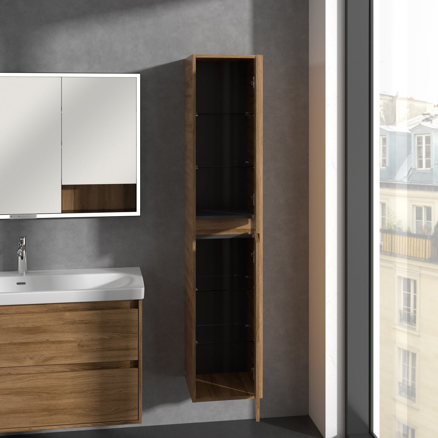 Perfekt kombinierbar mit weiteren Möbeln der Skyla Kollektion im gleichen Dekor für ein harmonisches Gesamtbild. Ergänzend dazu: der Villeroy & Boch Spiegel More to See Lite+ für noch mehr Funktionalität am Waschplatz.