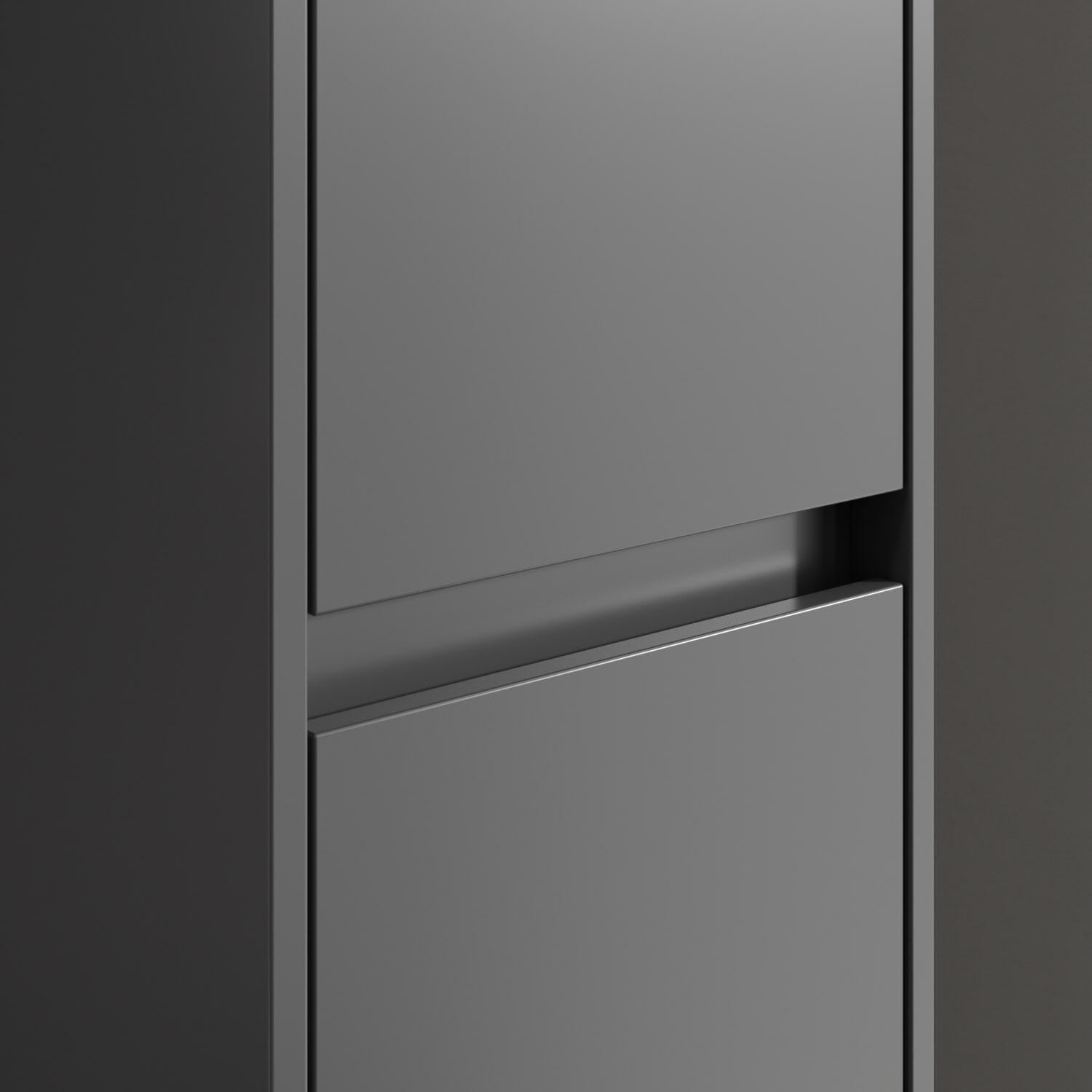 Zwei Türen mit Griffmulden und dezente Fronten unterstreichen das cleane Design. Dahinter sorgen hochwertige Glas-Einlegeböden für eine edle Optik und bieten gleichzeitig optimalen Stauraum für Pflegeprodukte, Handtücher und mehr.