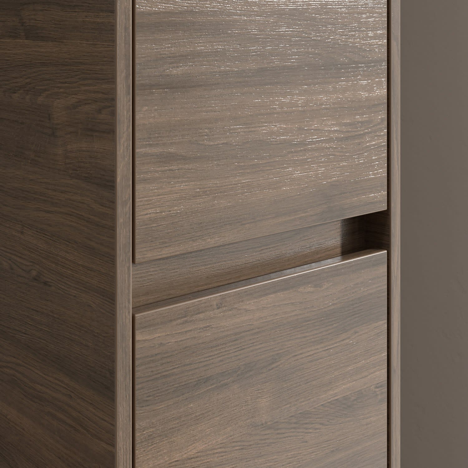 Zwei Türen mit Griffmulden und dezente Fronten unterstreichen das cleane Design. Dahinter sorgen hochwertige Glas-Einlegeböden für eine edle Optik und bieten gleichzeitig optimalen Stauraum für Pflegeprodukte, Handtücher und mehr.