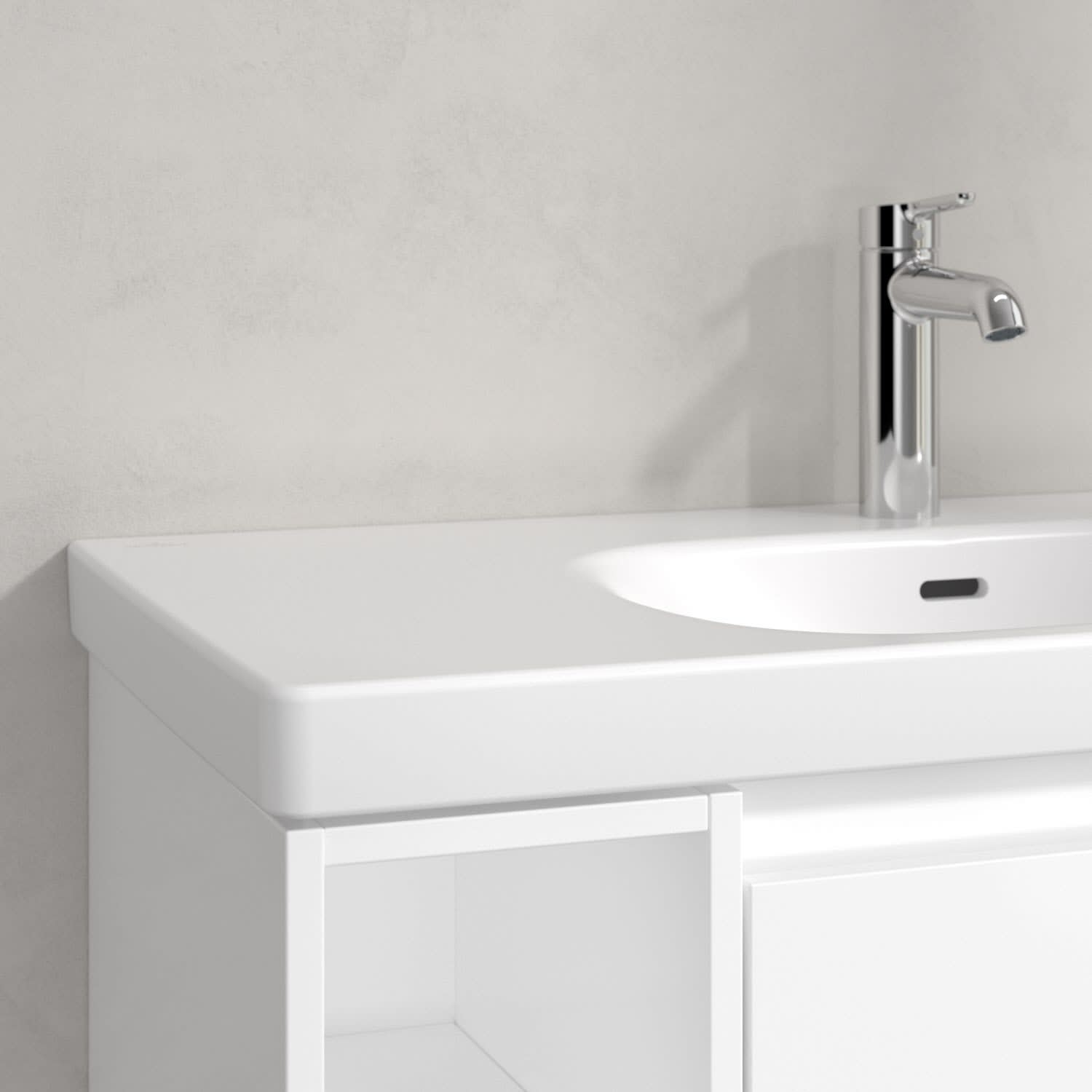 Klare Linien, sanfte Rundungen und raffinierte Gestaltungsdetails: Der Schrankwaschtisch der Kollektion Skyla von Villeroy & Boch vereint trendbewusstes Design mit durchdachter Funktion. Die eckige Außenform der Keramik trifft auf sanft abgerundete Innenkonturen – eine harmonische Kombination für jedes Badezimmer, ob Familienbad oder Wellness-Oase. Die asymmetrische Gestaltung setzt nicht nur ein modernes Design-Statement, sondern schafft mit der seitlichen Ablagefläche viel Platz zum Abstellen von Badutensilien. Die weichen Beckenkonturen bieten ein angenehmes Nutzungserlebnis und sind besonders pflegeleicht. Die extra robuste Oberfläche (TitanCeram) macht den Waschtisch besonders kratzfest. Zeitlose Eleganz im Bad in bewährter Villeroy & Boch Qualität.