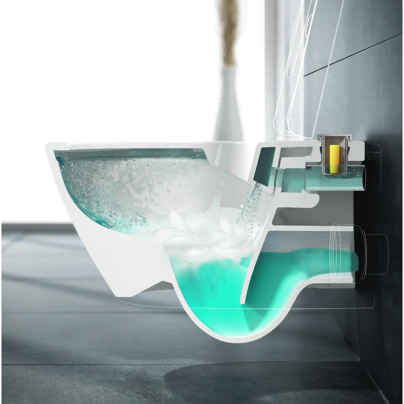 Das spülrandlose WC der Bestseller-Kollektion von Villeroy & Boch verbindet modernes Design mit optimaler Hygiene dank der integrierten Frischelösung ViFresh. Das verdeckte Frischefach ist direkt am WC-Wasserzulauf angebracht und fasst gängige WC-Steine und Gelspüler. Die Lösung für eine hygienische Frische mit gleichmäßiger Dosierung bei jeder Spülung! Außerdem werden Verschmutzungen und Bakterienherde aufgrund des spülrandlosen Designs vermieden. Gespült wird das komplette Innenbecken – ein Überspritzen wird dank idealer Wasserführung vermieden. ViFresh und DirectFlush in Kombination machen die WC-Reinigung und -Pflege zum Kinderspiel.