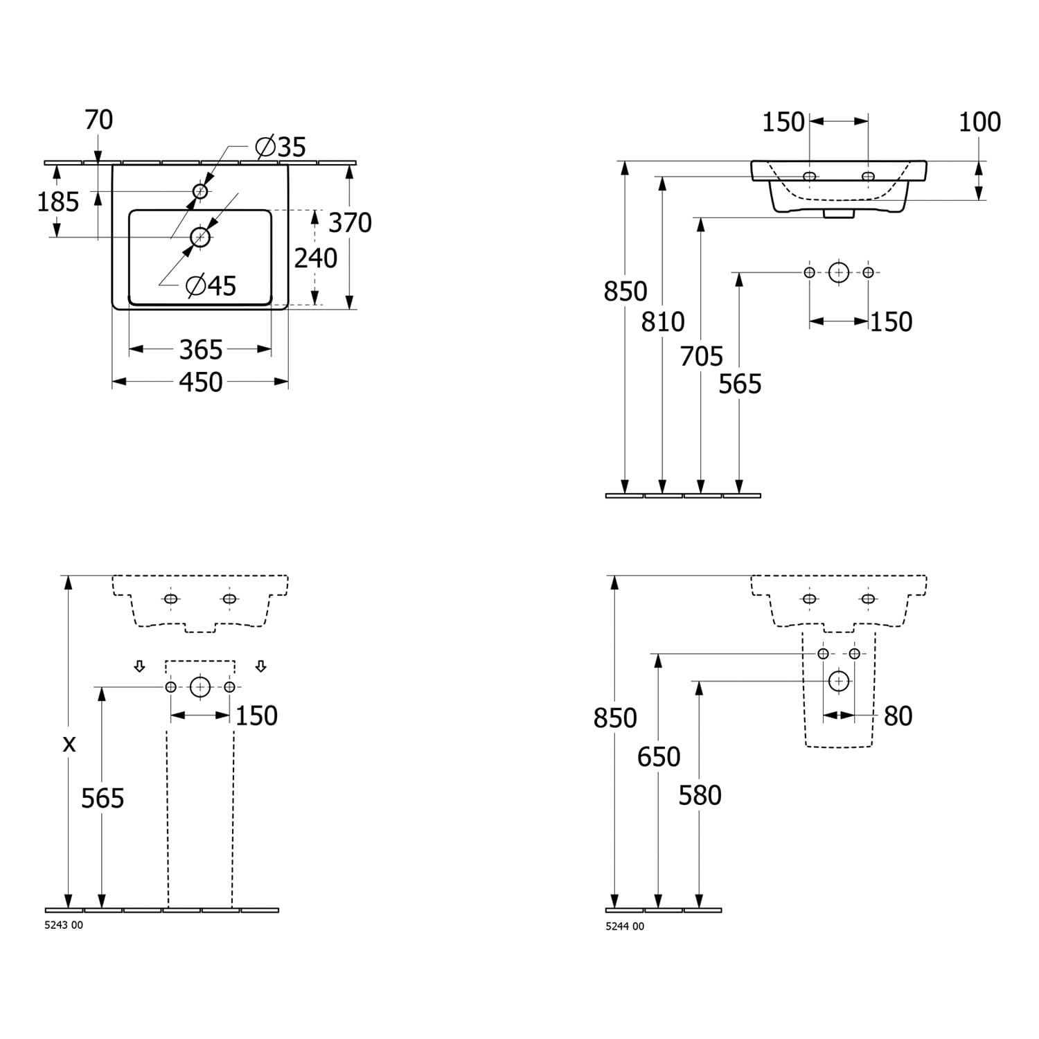 Villeroy & Boch Subway 3.0 Handwaschbecken 45 cm, für Möbelmontage, mit 1 Hahnloch, mit Überlauf