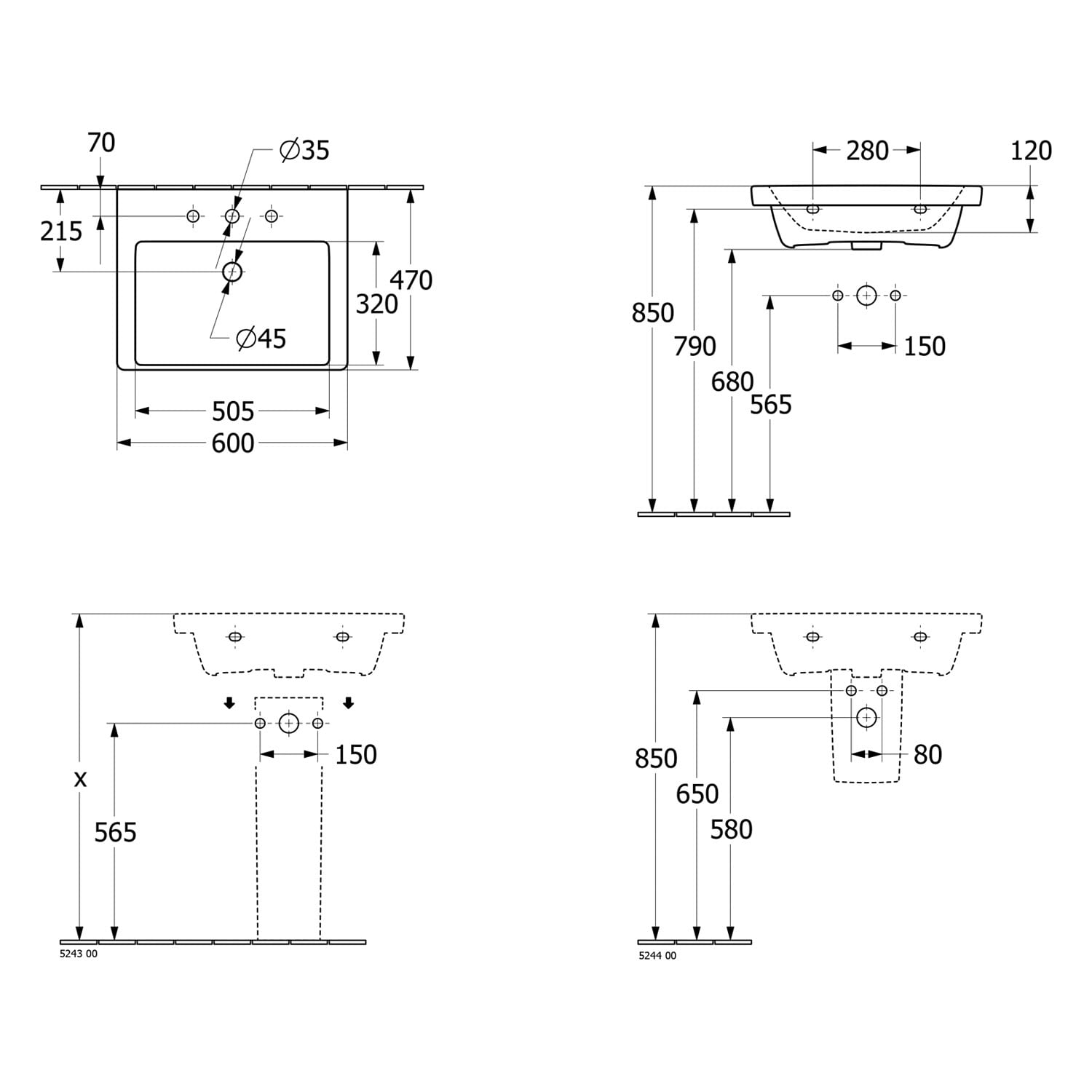 Villeroy & Boch Subway 3.0 Waschtisch 60 cm, mit 1 Hahnloch, mit Überlauf