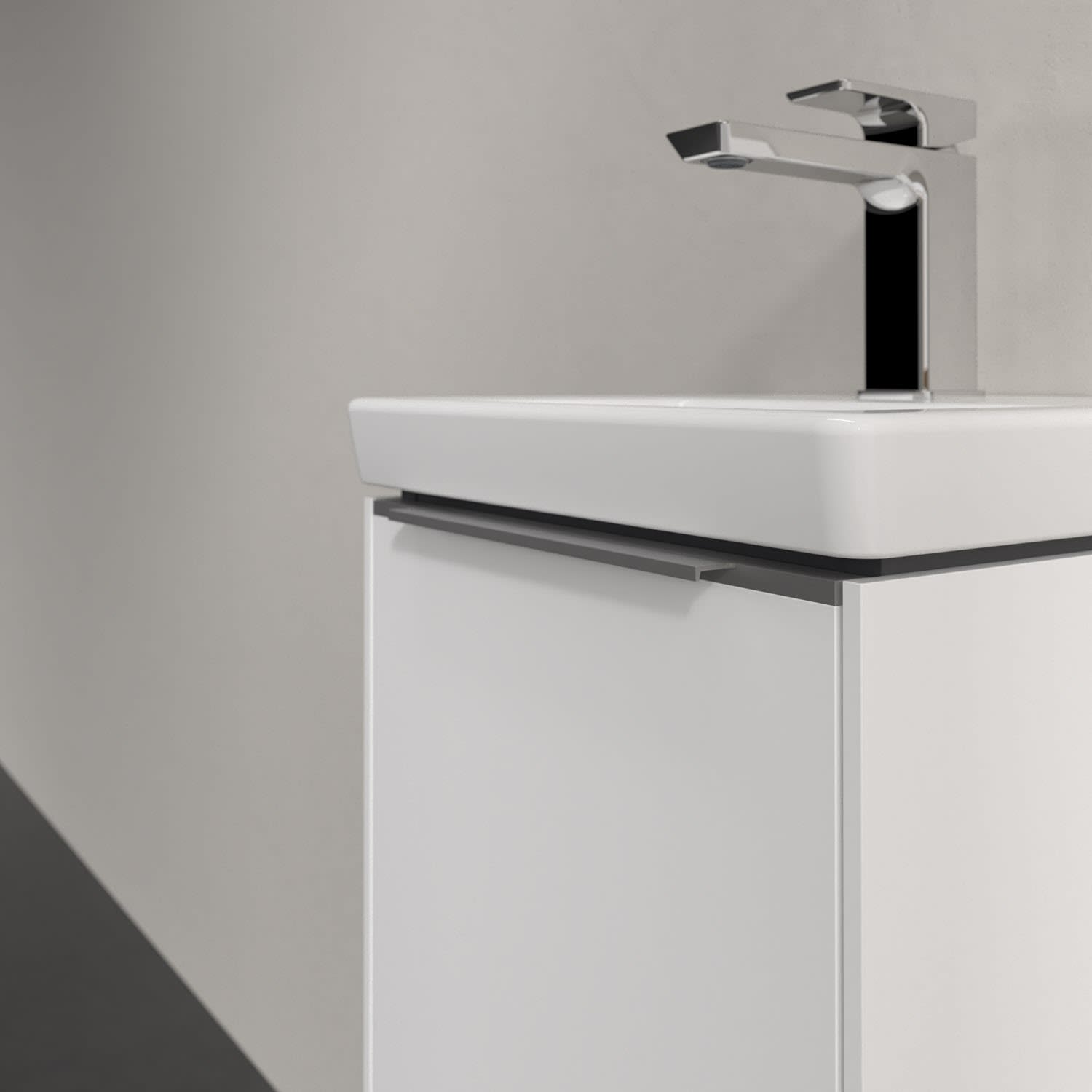 Der Waschtischunterschrank der Kollektion Subway 3.0 von Villeroy & Boch besticht durch gradliniges, zeitloses Design und ausreichend Stauraum. Front und Korpus sind mit einer hochwertigen Direktbeschichtung oder Lackierung, deren Anti-Fingerprint-Oberfläche unschönen Fingerabdrücken vorbeugt, versehen. Hinter der Tür findet sich großzügiger Stauraum für Pflege- und Hygieneartikel. Die dezente Griffleiste sorgt für einfache Handhabung und bildet einen besonderen Design-Akzent.