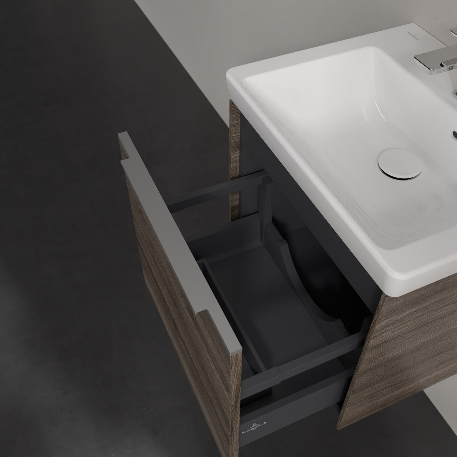 Der Waschbeckenunterschrank der Kollektion Subway 3.0 von Villeroy & Boch besticht durch gradliniges, zeitloses Design und großzügigen Stauraum. Front und Korpus sind mit einer hochwertigen Direktbeschichtung oder Lackierung, deren Anti-Fingerprint-Oberfläche unschönen Fingerabdrücken vorbeugt, versehen. Eine voll ausziehbare Schublade mit rutschhemmendem Boden, Selbsteinzug-Funktion sowie einer integrierten kleinen Accessory-Box bietet Platz für Pflege- und Hygieneartikel. Die dezente Griffleiste sorgt für einfache Handhabung und bildet einen besonderen Design-Akzent.