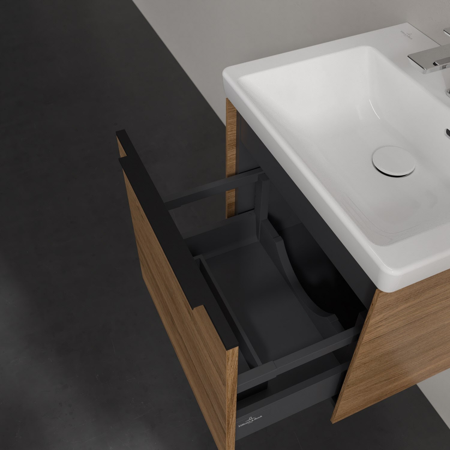 Der Waschbeckenunterschrank der Kollektion Subway 3.0 von Villeroy & Boch besticht durch gradliniges, zeitloses Design und großzügigen Stauraum. Front und Korpus sind mit einer hochwertigen Direktbeschichtung oder Lackierung, deren Anti-Fingerprint-Oberfläche unschönen Fingerabdrücken vorbeugt, versehen. Eine voll ausziehbare Schublade mit rutschhemmendem Boden, Selbsteinzug-Funktion sowie einer integrierten kleinen Accessory-Box bietet Platz für Pflege- und Hygieneartikel. Die dezente Griffleiste sorgt für einfache Handhabung und bildet einen besonderen Design-Akzent.