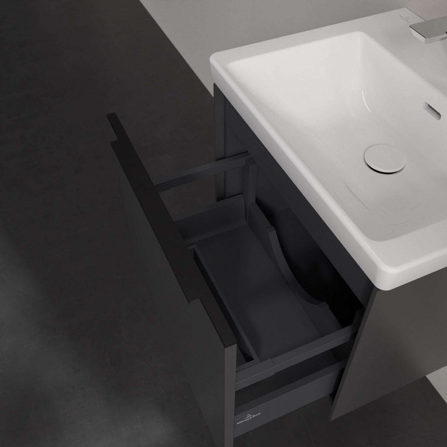 Der Waschbeckenunterschrank der Kollektion Subway 3.0 von Villeroy & Boch besticht durch gradliniges, zeitloses Design und großzügigen Stauraum. Front und Korpus sind mit einer hochwertigen Direktbeschichtung oder Lackierung, deren Anti-Fingerprint-Oberfläche unschönen Fingerabdrücken vorbeugt, versehen. Eine voll ausziehbare Schublade mit rutschhemmendem Boden, Selbsteinzug-Funktion sowie einer integrierten kleinen Accessory-Box bietet Platz für Pflege- und Hygieneartikel. Die dezente Griffleiste sorgt für einfache Handhabung und bildet einen besonderen Design-Akzent.