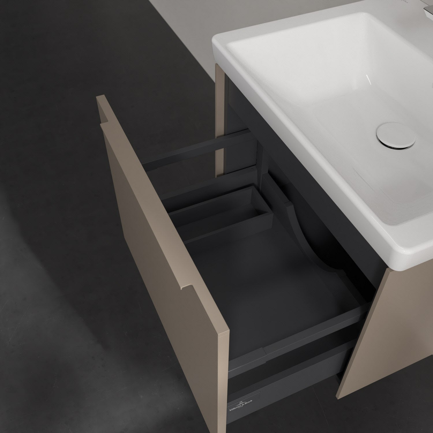 Der Waschbeckenunterschrank der Kollektion Subway 3.0 von Villeroy & Boch besticht durch gradliniges, zeitloses Design und großzügigen Stauraum. Front und Korpus sind mit einer hochwertigen Direktbeschichtung oder Lackierung, deren Anti-Fingerprint-Oberfläche unschönen Fingerabdrücken vorbeugt, versehen. Eine voll ausziehbare Schublade mit rutschhemmendem Boden, Selbsteinzug-Funktion sowie einer integrierten kleinen Accessory-Box bietet Platz für Pflege- und Hygieneartikel. Die dezente Griffleiste sorgt für einfache Handhabung und bildet einen besonderen Design-Akzent.