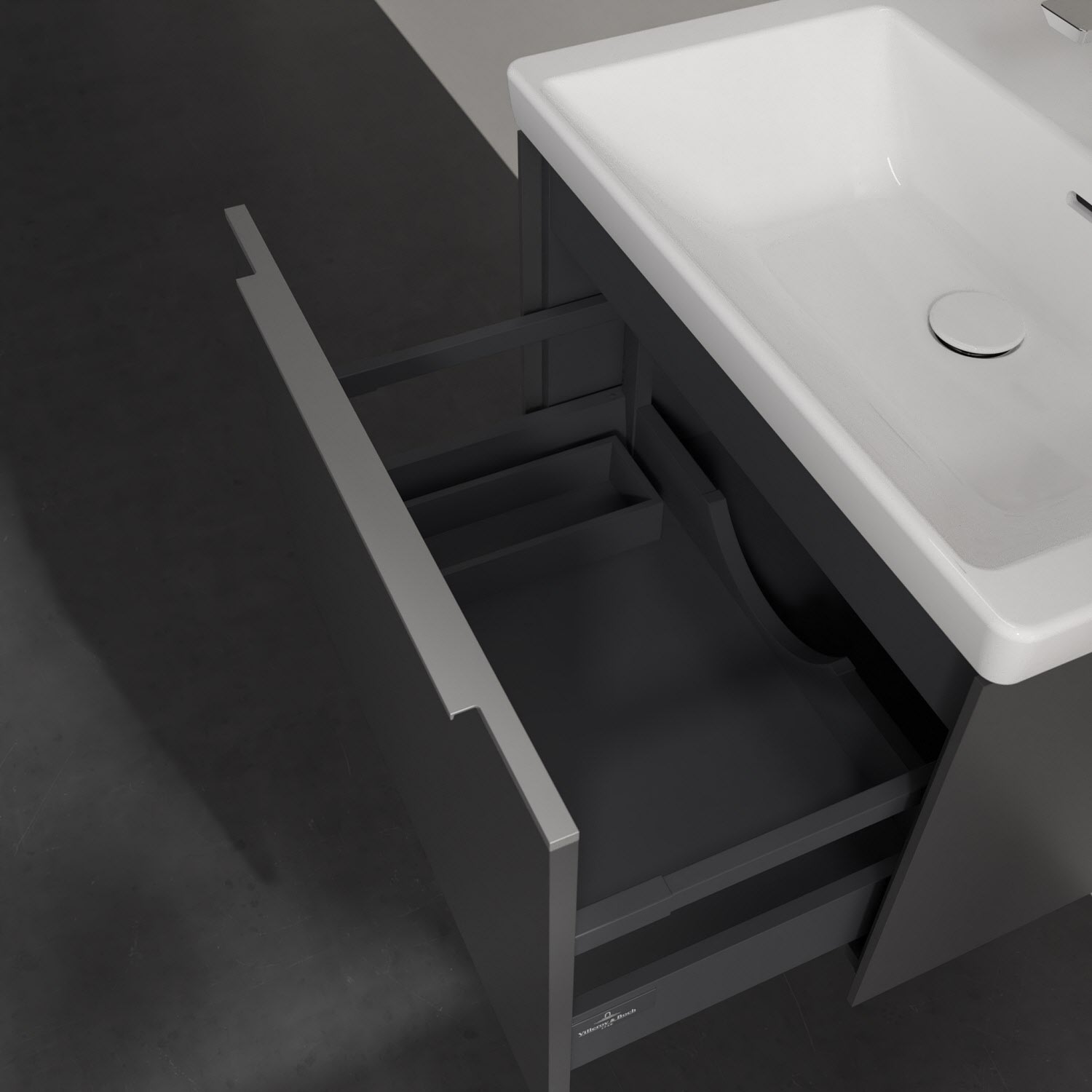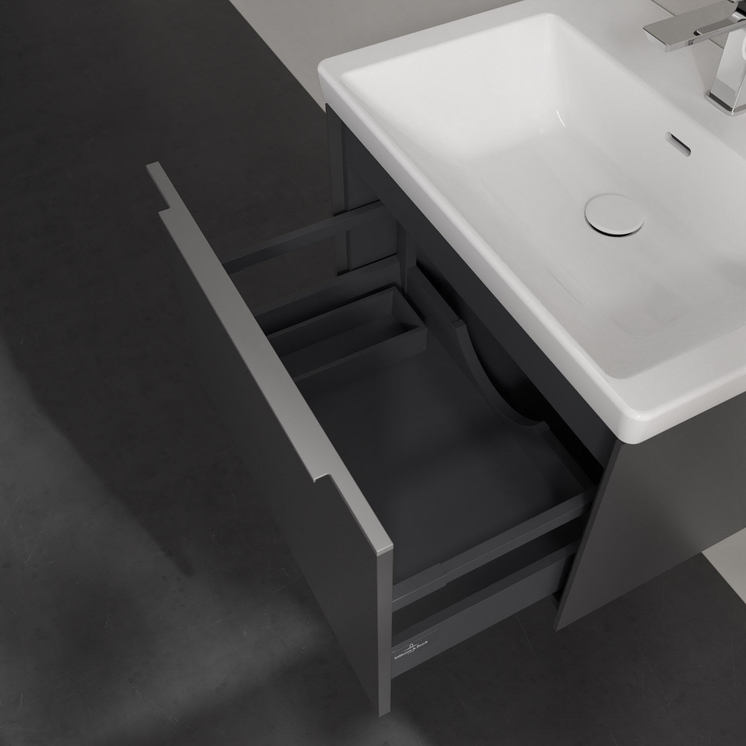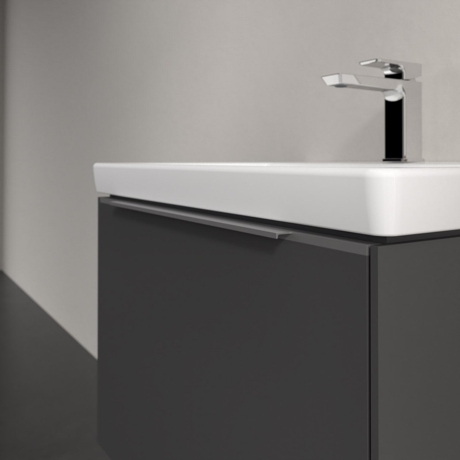 Der Waschbeckenunterschrank der Kollektion Subway 3.0 von Villeroy & Boch besticht durch gradliniges, zeitloses Design und großzügigen Stauraum. Front und Korpus sind mit einer hochwertigen Direktbeschichtung oder Lackierung, deren Anti-Fingerprint-Oberfläche unschönen Fingerabdrücken vorbeugt, versehen. Eine voll ausziehbare Schublade mit rutschhemmendem Boden, Selbsteinzug-Funktion sowie einer integrierten kleinen Accessory-Box bietet Platz für Pflege- und Hygieneartikel. Die dezente Griffleiste sorgt für einfache Handhabung und bildet einen besonderen Design-Akzent.