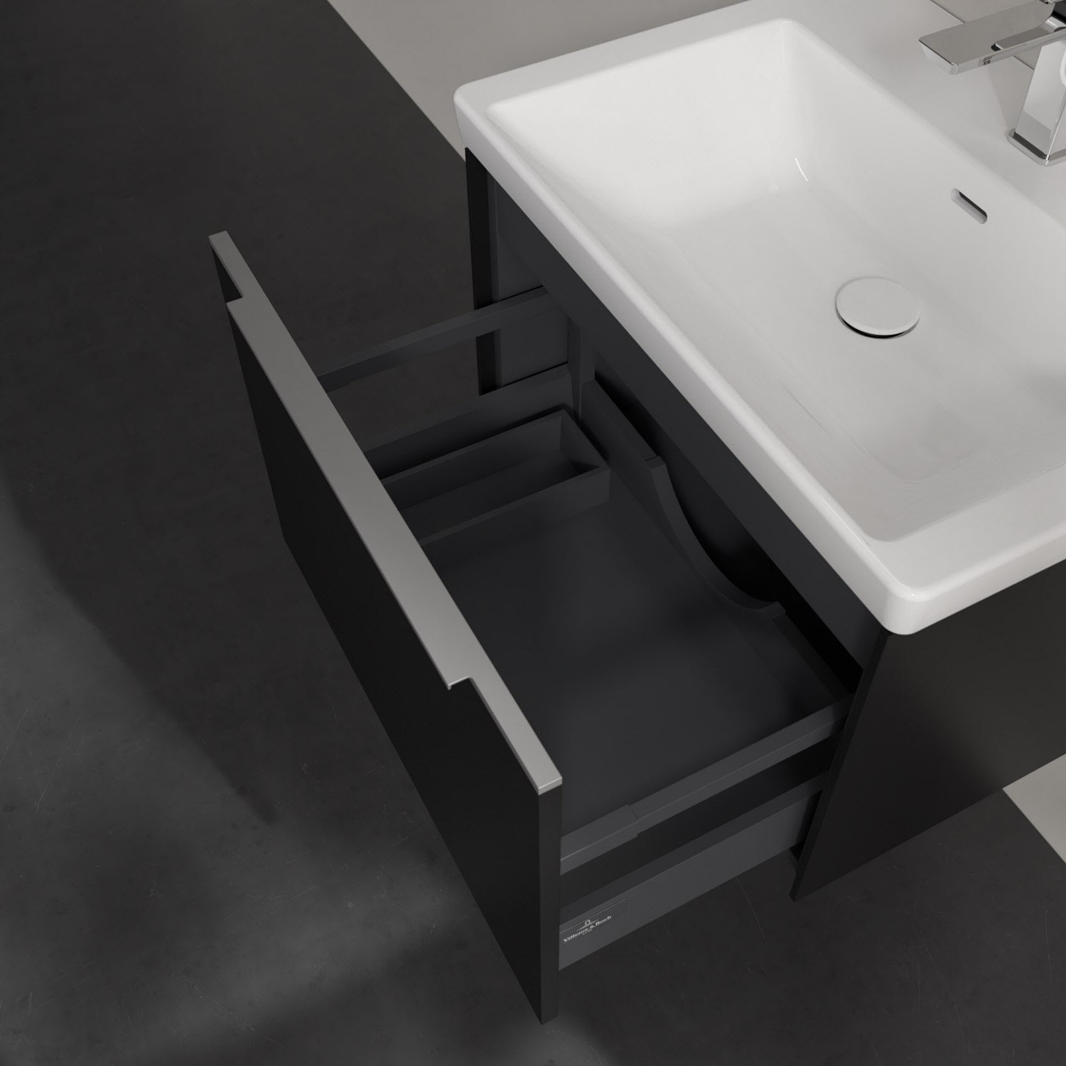 Der Waschbeckenunterschrank der Kollektion Subway 3.0 von Villeroy & Boch besticht durch gradliniges, zeitloses Design und großzügigen Stauraum. Front und Korpus sind mit einer hochwertigen Direktbeschichtung oder Lackierung, deren Anti-Fingerprint-Oberfläche unschönen Fingerabdrücken vorbeugt, versehen. Eine voll ausziehbare Schublade mit rutschhemmendem Boden, Selbsteinzug-Funktion sowie einer integrierten kleinen Accessory-Box bietet Platz für Pflege- und Hygieneartikel. Die dezente Griffleiste sorgt für einfache Handhabung und bildet einen besonderen Design-Akzent.
