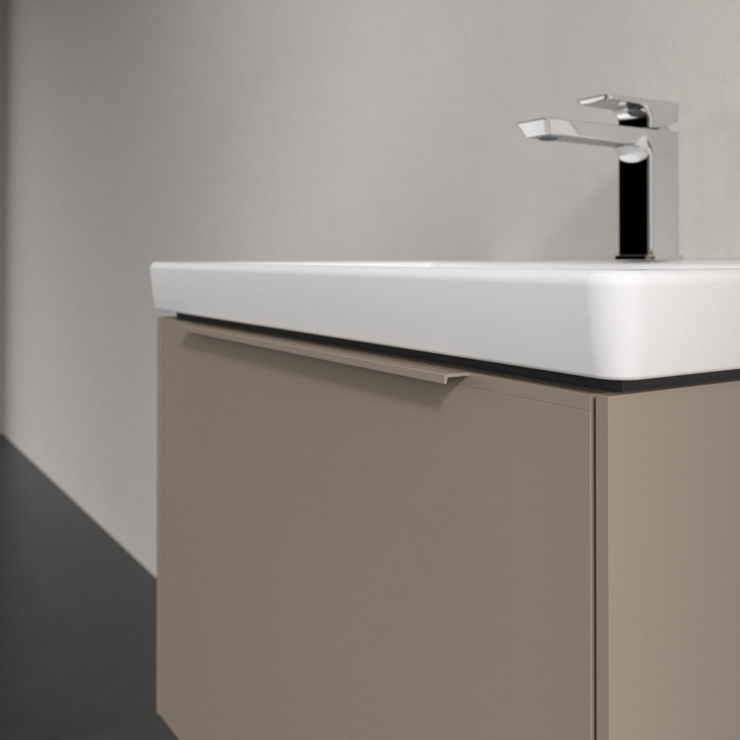 Der Waschbeckenunterschrank der Kollektion Subway 3.0 von Villeroy & Boch besticht durch gradliniges, zeitloses Design und großzügigen Stauraum. Front und Korpus sind mit einer hochwertigen Direktbeschichtung oder Lackierung, deren Anti-Fingerprint-Oberfläche unschönen Fingerabdrücken vorbeugt, versehen. Eine voll ausziehbare Schublade mit rutschhemmendem Boden, Selbsteinzug-Funktion sowie einer integrierten kleinen Accessory-Box bietet Platz für Pflege- und Hygieneartikel. Die dezente Griffleiste sorgt für einfache Handhabung und bildet einen besonderen Design-Akzent.