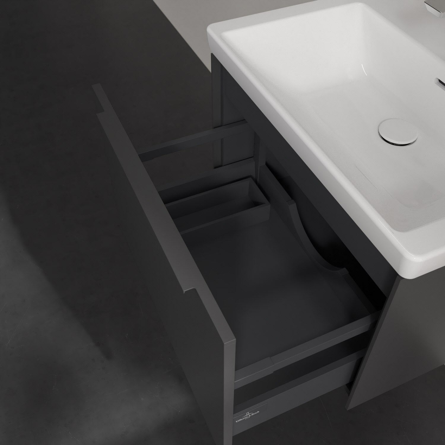 Der Waschbeckenunterschrank der Kollektion Subway 3.0 von Villeroy & Boch besticht durch gradliniges, zeitloses Design und großzügigen Stauraum. Front und Korpus sind mit einer hochwertigen Direktbeschichtung oder Lackierung, deren Anti-Fingerprint-Oberfläche unschönen Fingerabdrücken vorbeugt, versehen. Eine voll ausziehbare Schublade mit rutschhemmendem Boden, Selbsteinzug-Funktion sowie einer integrierten kleinen Accessory-Box bietet Platz für Pflege- und Hygieneartikel. Die dezente Griffleiste sorgt für einfache Handhabung und bildet einen besonderen Design-Akzent.