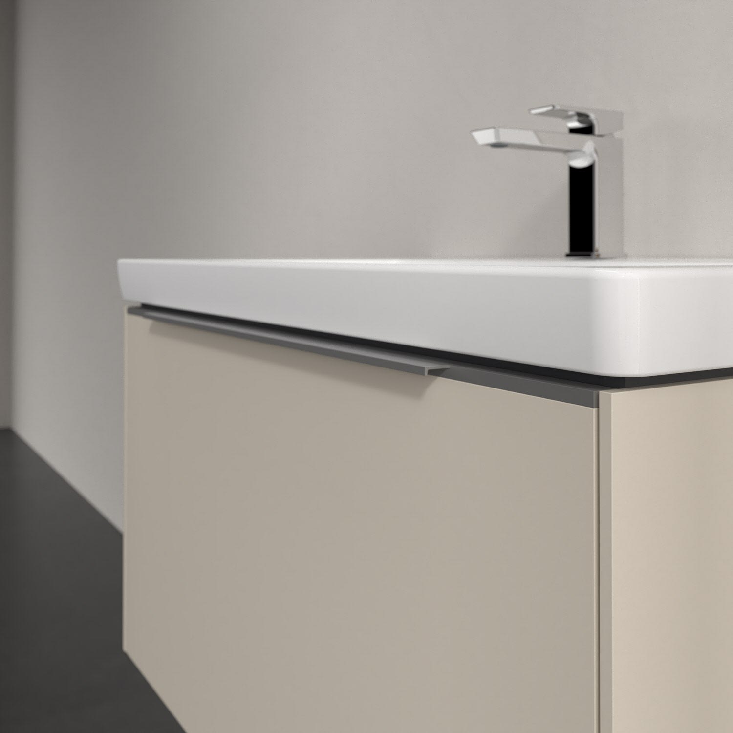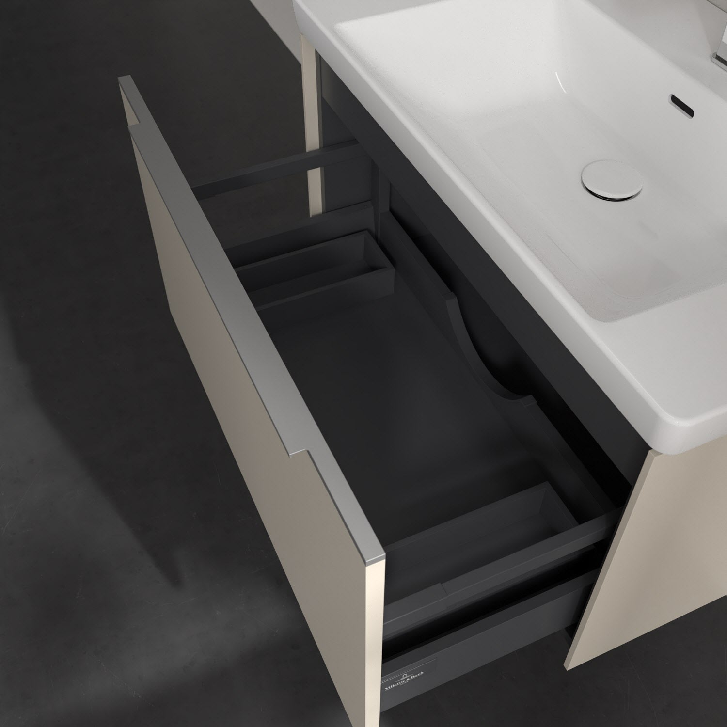 Der Waschbeckenunterschrank der Kollektion Subway 3.0 von Villeroy & Boch besticht durch gradliniges, zeitloses Design und großzügigen Stauraum. Front und Korpus sind mit einer hochwertigen Direktbeschichtung oder Lackierung, deren Anti-Fingerprint-Oberfläche unschönen Fingerabdrücken vorbeugt, versehen. Eine voll ausziehbare Schublade mit rutschhemmendem Boden, Selbsteinzug-Funktion sowie zwei integrierten kleinen Accessory-Boxen bietet Platz für Pflege- und Hygieneartikel. Die dezente Griffleiste sorgt für einfache Handhabung und bildet einen besonderen Design-Akzent.