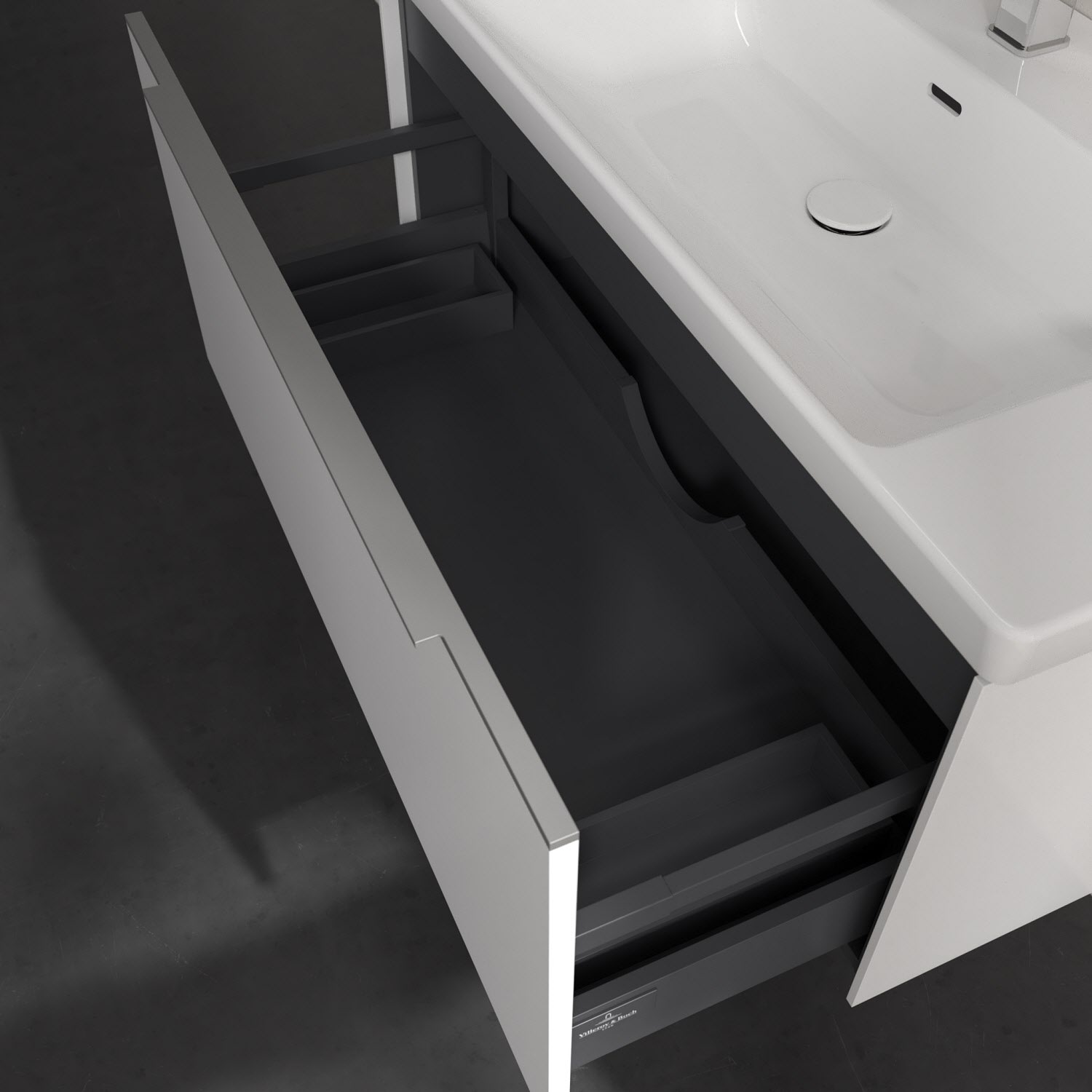 Der Waschbeckenunterschrank der Kollektion Subway 3.0 von Villeroy & Boch besticht durch gradliniges, zeitloses Design und großzügigen Stauraum. Front und Korpus sind mit einer hochwertigen Direktbeschichtung oder Lackierung, deren Anti-Fingerprint-Oberfläche unschönen Fingerabdrücken vorbeugt, versehen. Eine voll ausziehbare Schublade mit rutschhemmendem Boden, Selbsteinzug-Funktion sowie zwei integrierten kleinen Accessory-Boxen bietet Platz für Pflege- und Hygieneartikel. Die dezente Griffleiste sorgt für einfache Handhabung und bildet einen besonderen Design-Akzent.