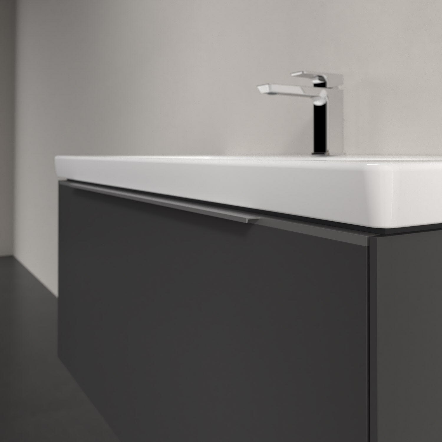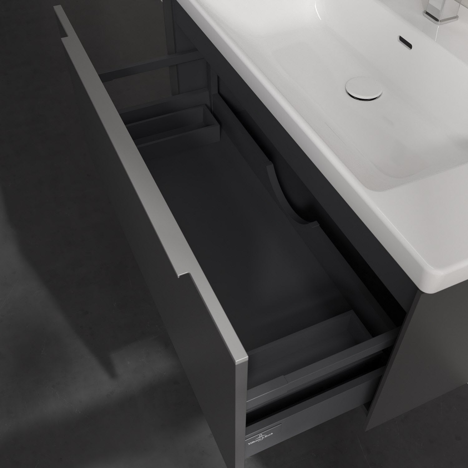 Der Waschbeckenunterschrank der Kollektion Subway 3.0 von Villeroy & Boch besticht durch gradliniges, zeitloses Design und großzügigen Stauraum. Front und Korpus sind mit einer hochwertigen Direktbeschichtung oder Lackierung, deren Anti-Fingerprint-Oberfläche unschönen Fingerabdrücken vorbeugt, versehen. Eine voll ausziehbare Schublade mit rutschhemmendem Boden, Selbsteinzug-Funktion sowie zwei integrierten kleinen Accessory-Boxen bietet Platz für Pflege- und Hygieneartikel. Die dezente Griffleiste sorgt für einfache Handhabung und bildet einen besonderen Design-Akzent.
