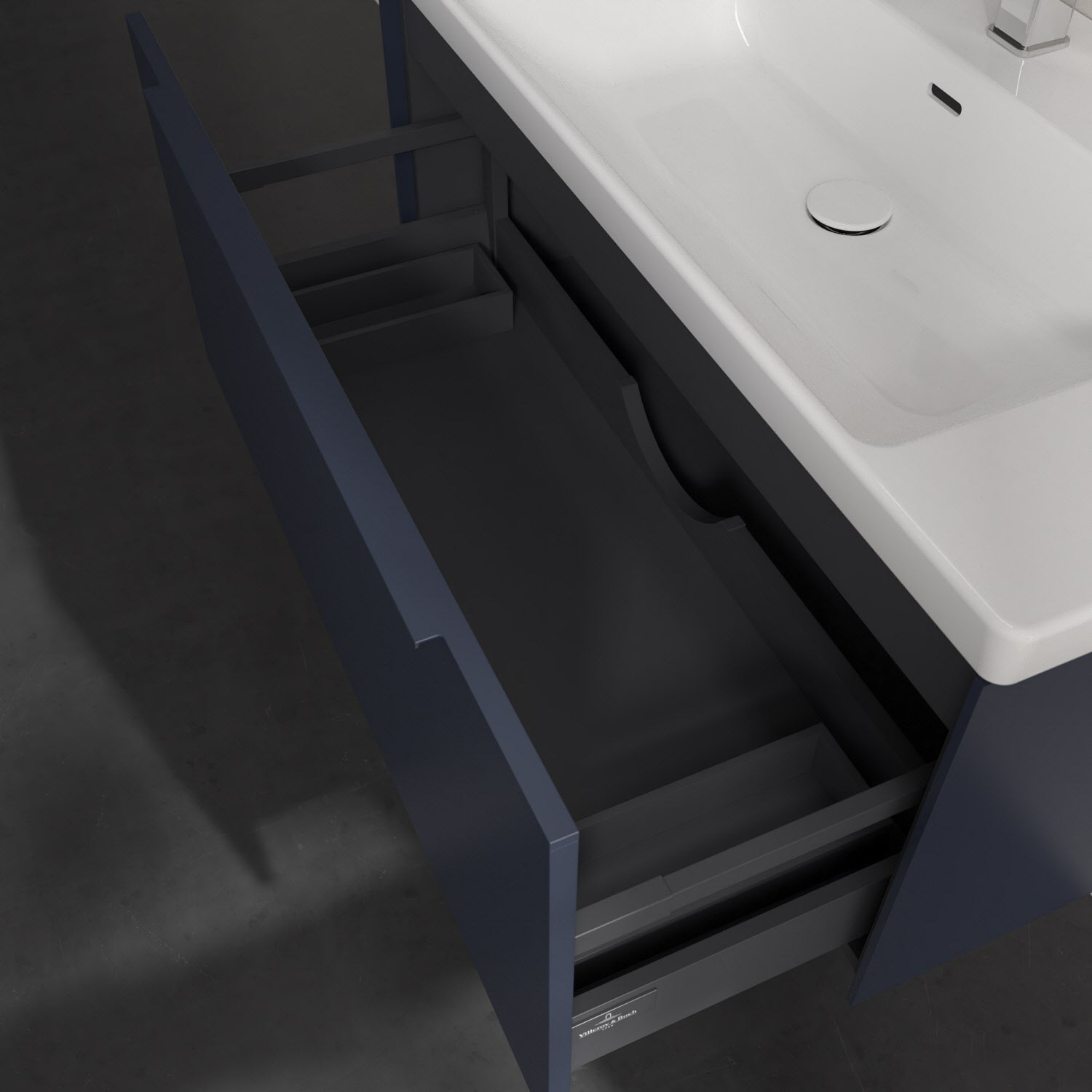 Der Waschbeckenunterschrank der Kollektion Subway 3.0 von Villeroy & Boch besticht durch gradliniges, zeitloses Design und großzügigen Stauraum. Front und Korpus sind mit einer hochwertigen Direktbeschichtung oder Lackierung, deren Anti-Fingerprint-Oberfläche unschönen Fingerabdrücken vorbeugt, versehen. Eine voll ausziehbare Schublade mit rutschhemmendem Boden, Selbsteinzug-Funktion sowie zwei integrierten kleinen Accessory-Boxen bietet Platz für Pflege- und Hygieneartikel. Die dezente Griffleiste sorgt für einfache Handhabung und bildet einen besonderen Design-Akzent.