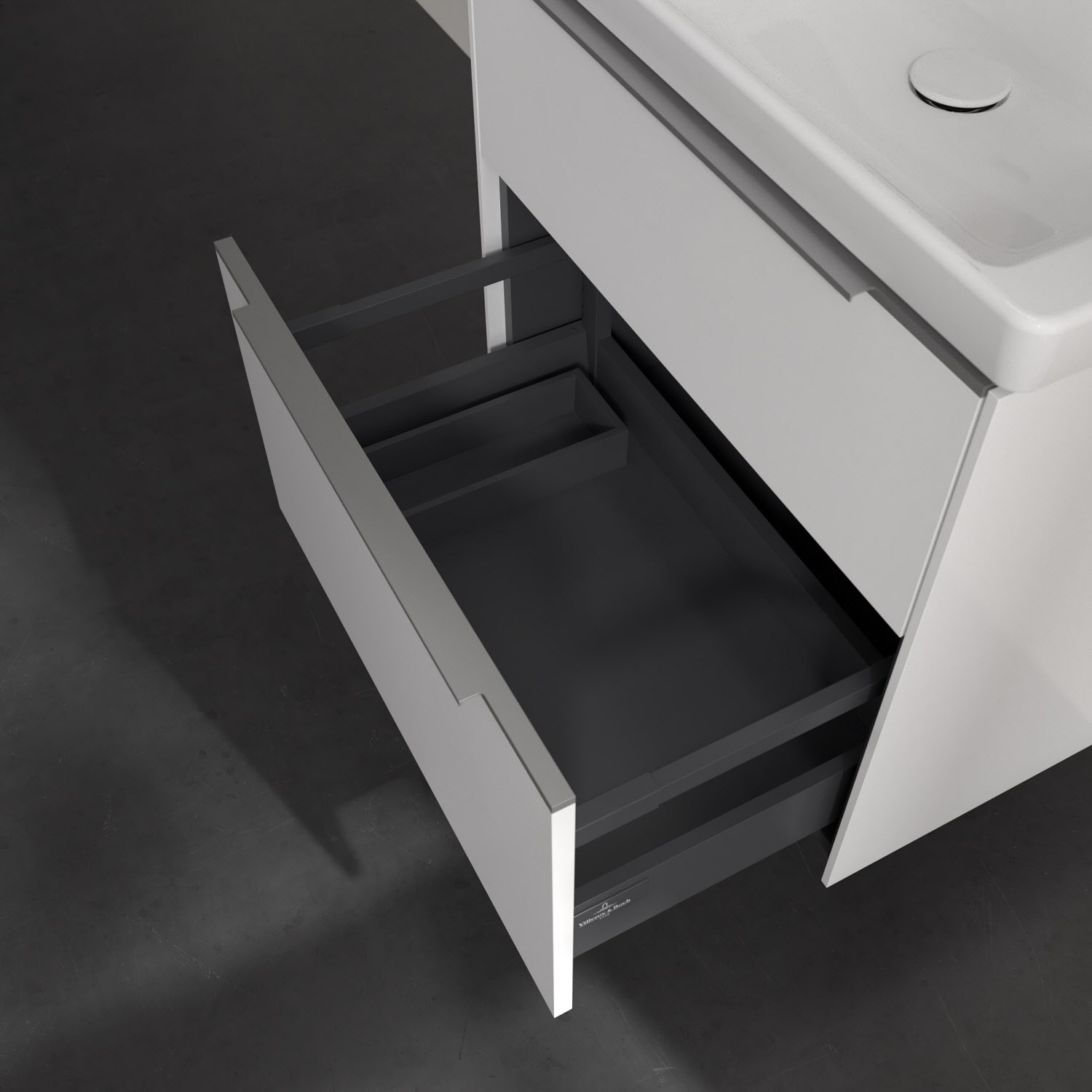 Der Waschtischunterschrank der Kollektion Subway 3.0 von Villeroy & Boch besticht durch gradliniges, zeitloses Design und großzügigen Stauraum. Front und Korpus sind mit einer hochwertigen Direktbeschichtung oder Lackierung, deren Anti-Fingerprint-Oberfläche unschönen Fingerabdrücken vorbeugt, versehen. Zwei voll ausziehbare Schubladen mit rutschhemmenden Böden, Selbsteinzug-Funktion sowie einer integrierten kleinen Accessory-Box bieten extra viel Platz für Pflege- und Hygieneartikel. Die dezente Griffleiste sorgt für einfache Handhabung und bildet einen besonderen Design-Akzent.