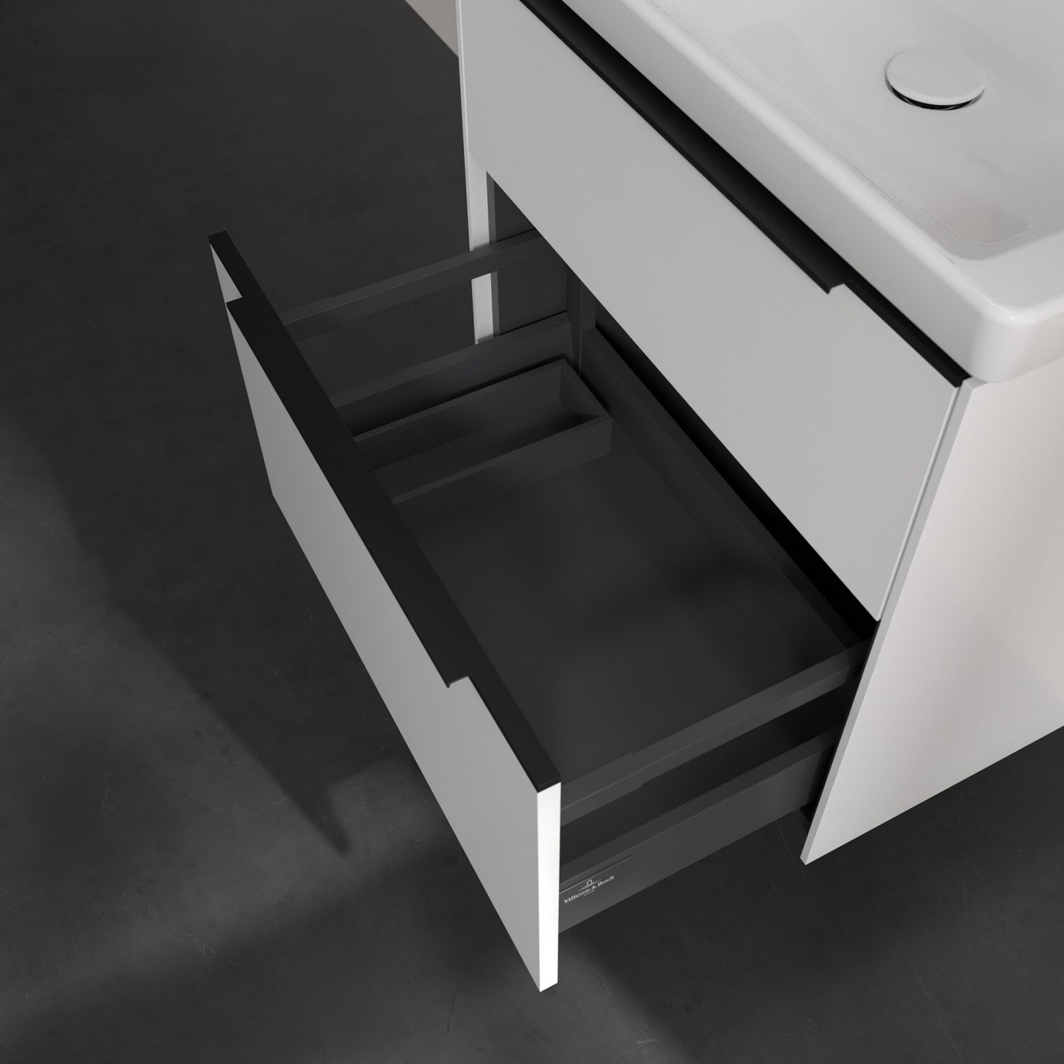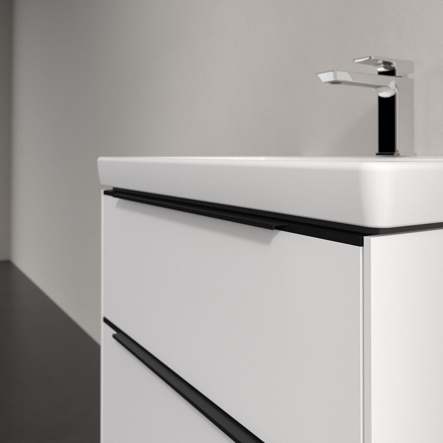 Der Waschtischunterschrank der Kollektion Subway 3.0 von Villeroy & Boch besticht durch gradliniges, zeitloses Design und großzügigen Stauraum. Front und Korpus sind mit einer hochwertigen Direktbeschichtung oder Lackierung, deren Anti-Fingerprint-Oberfläche unschönen Fingerabdrücken vorbeugt, versehen. Zwei voll ausziehbare Schubladen mit rutschhemmenden Böden, Selbsteinzug-Funktion sowie einer integrierten kleinen Accessory-Box bieten extra viel Platz für Pflege- und Hygieneartikel. Die dezente Griffleiste sorgt für einfache Handhabung und bildet einen besonderen Design-Akzent.
