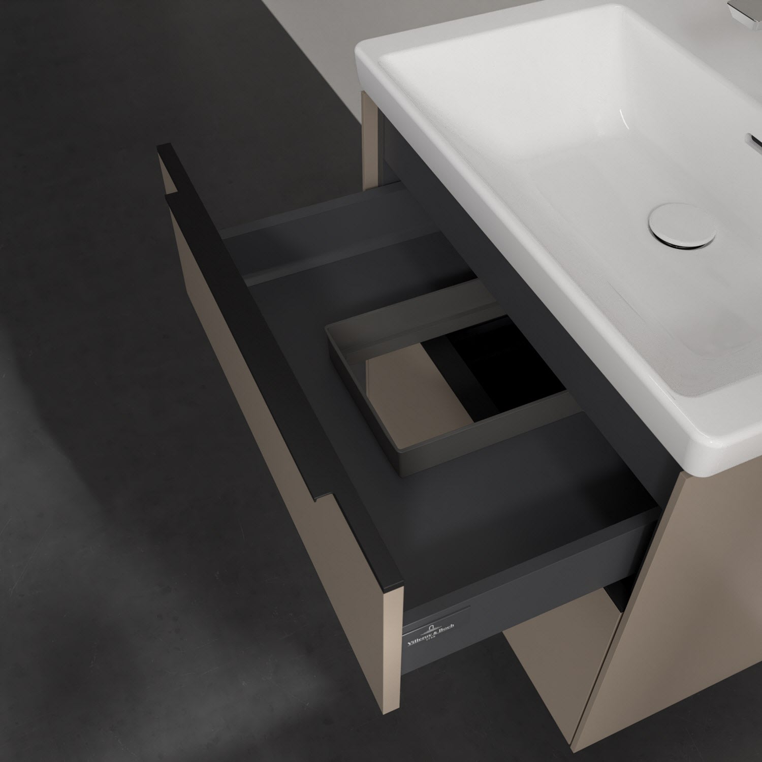 Der Waschtischunterschrank der Kollektion Subway 3.0 von Villeroy & Boch besticht durch gradliniges, zeitloses Design und großzügigen Stauraum. Front und Korpus sind mit einer hochwertigen Direktbeschichtung oder Lackierung, deren Anti-Fingerprint-Oberfläche unschönen Fingerabdrücken vorbeugt, versehen. Zwei voll ausziehbare Schubladen mit rutschhemmenden Böden, Selbsteinzug-Funktion sowie einer integrierten kleinen Accessory-Box bieten extra viel Platz für Pflege- und Hygieneartikel. Die dezente Griffleiste sorgt für einfache Handhabung und bildet einen besonderen Design-Akzent.