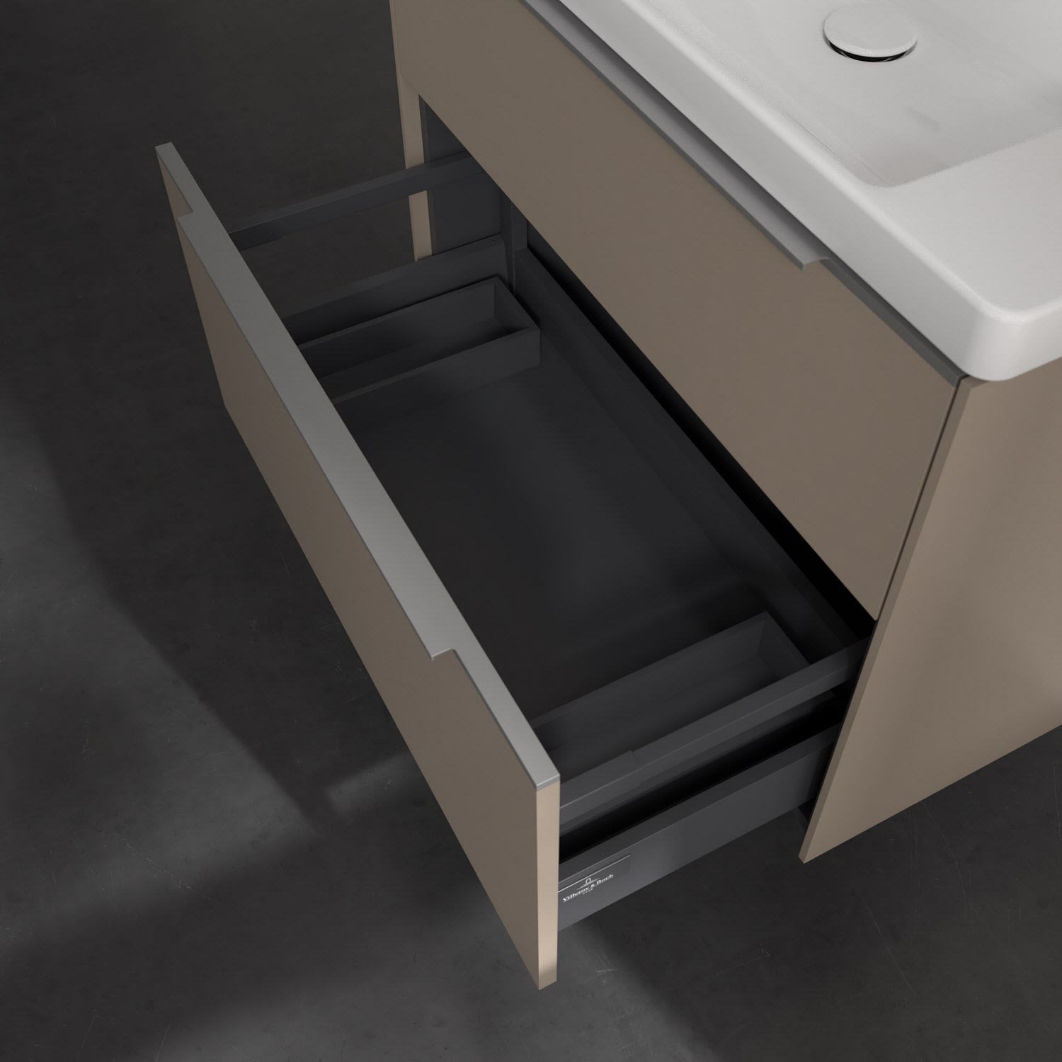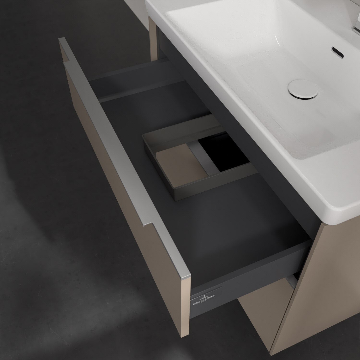 Der Waschtischunterschrank der Kollektion Subway 3.0 von Villeroy & Boch besticht durch gradliniges, zeitloses Design und großzügigen Stauraum. Front und Korpus sind mit einer hochwertigen Direktbeschichtung oder Lackierung, deren Anti-Fingerprint-Oberfläche unschönen Fingerabdrücken vorbeugt, versehen. Zwei voll ausziehbare Schubladen mit rutschhemmenden Böden, Selbsteinzug-Funktion sowie zwei integrierten kleinen Accessory-Boxen bieten extra viel Platz für Pflege- und Hygieneartikel. Die dezente Griffleiste sorgt für einfache Handhabung und bildet einen besonderen Design-Akzent.