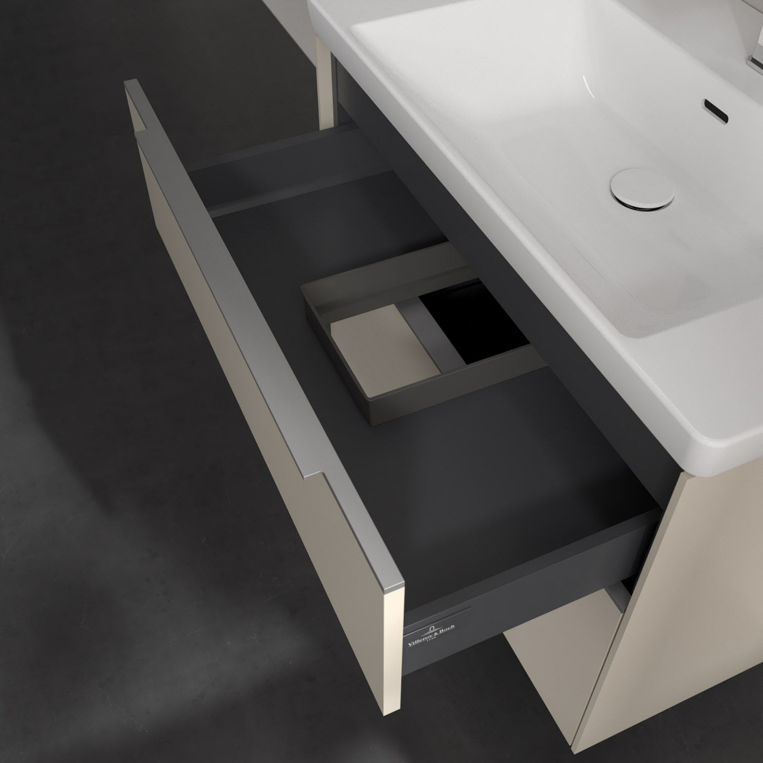 Der Waschtischunterschrank der Kollektion Subway 3.0 von Villeroy & Boch besticht durch gradliniges, zeitloses Design und großzügigen Stauraum. Front und Korpus sind mit einer hochwertigen Direktbeschichtung oder Lackierung, deren Anti-Fingerprint-Oberfläche unschönen Fingerabdrücken vorbeugt, versehen. Zwei voll ausziehbare Schubladen mit rutschhemmenden Böden, Selbsteinzug-Funktion sowie zwei integrierten kleinen Accessory-Boxen bieten extra viel Platz für Pflege- und Hygieneartikel. Die dezente Griffleiste sorgt für einfache Handhabung und bildet einen besonderen Design-Akzent.