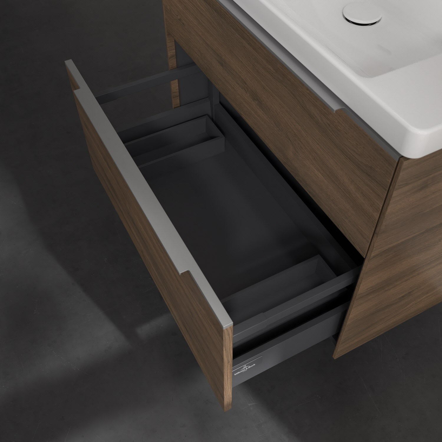 Der Waschtischunterschrank der Kollektion Subway 3.0 von Villeroy & Boch besticht durch gradliniges, zeitloses Design und großzügigen Stauraum. Front und Korpus sind mit einer hochwertigen Direktbeschichtung oder Lackierung, deren Anti-Fingerprint-Oberfläche unschönen Fingerabdrücken vorbeugt, versehen. Zwei voll ausziehbare Schubladen mit rutschhemmenden Böden, Selbsteinzug-Funktion sowie zwei integrierten kleinen Accessory-Boxen bieten extra viel Platz für Pflege- und Hygieneartikel. Die dezente Griffleiste sorgt für einfache Handhabung und bildet einen besonderen Design-Akzent.