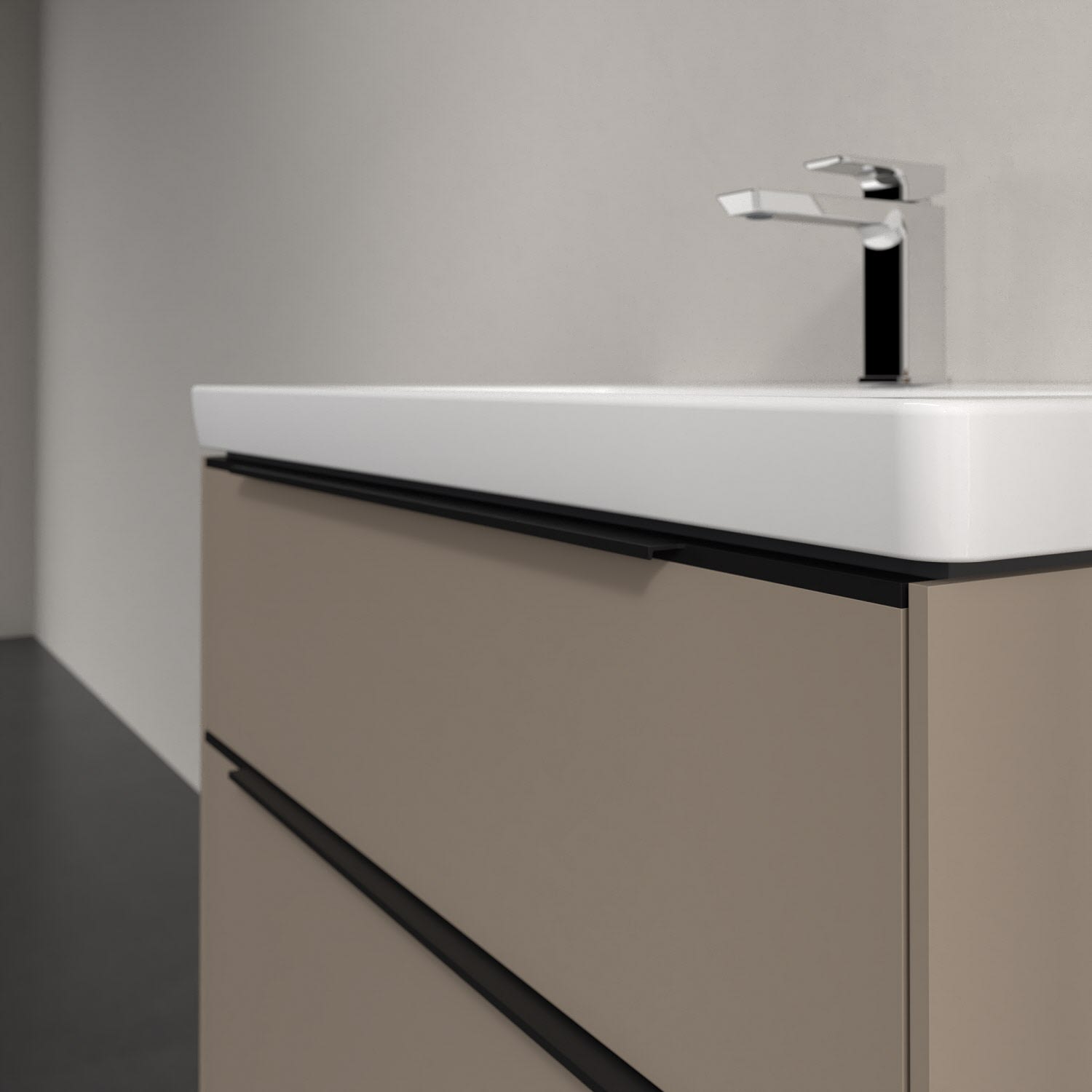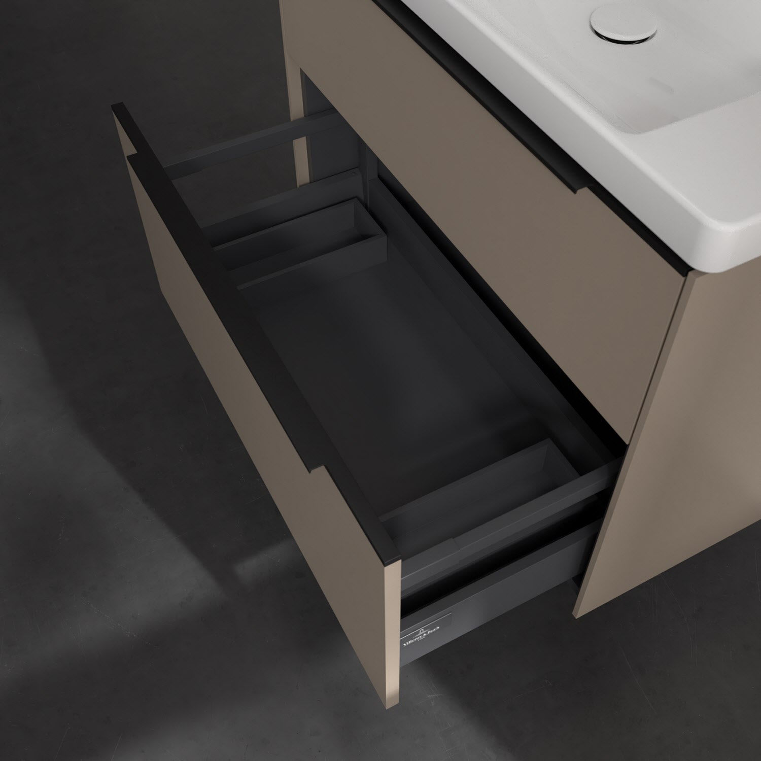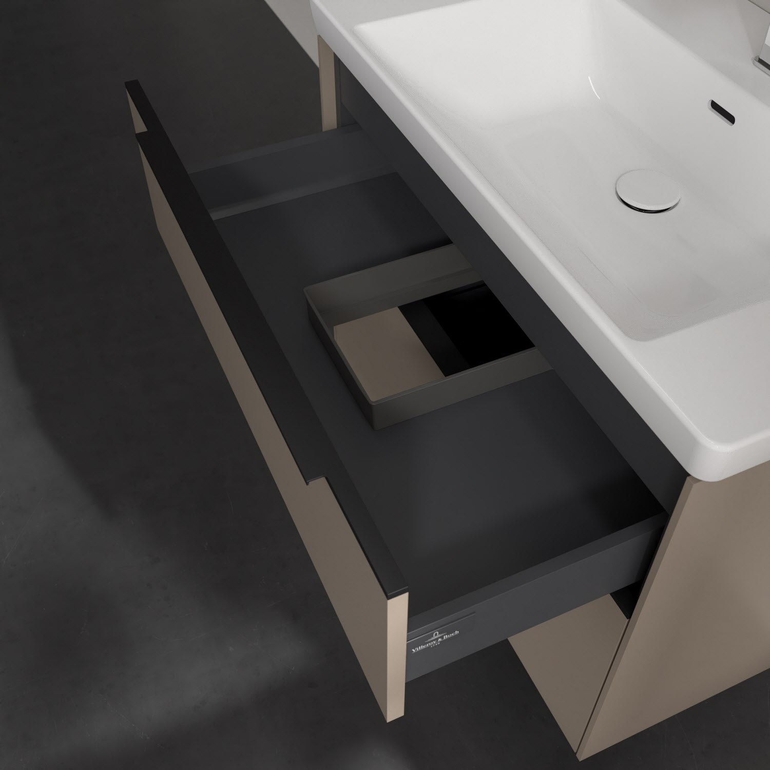 Der Waschtischunterschrank der Kollektion Subway 3.0 von Villeroy & Boch besticht durch gradliniges, zeitloses Design und großzügigen Stauraum. Front und Korpus sind mit einer hochwertigen Direktbeschichtung oder Lackierung, deren Anti-Fingerprint-Oberfläche unschönen Fingerabdrücken vorbeugt, versehen. Zwei voll ausziehbare Schubladen mit rutschhemmenden Böden, Selbsteinzug-Funktion sowie zwei integrierten kleinen Accessory-Boxen bieten extra viel Platz für Pflege- und Hygieneartikel. Die dezente Griffleiste sorgt für einfache Handhabung und bildet einen besonderen Design-Akzent.