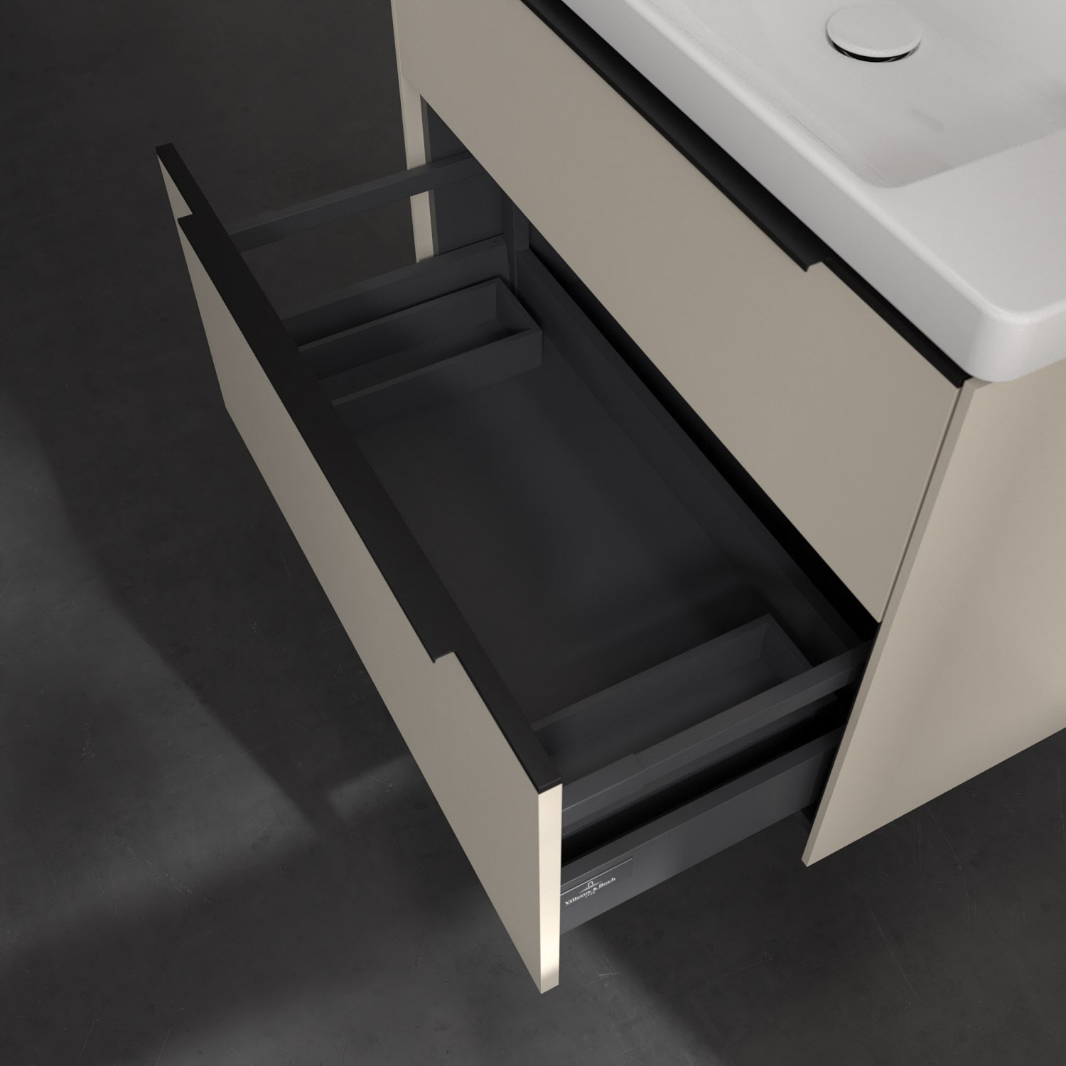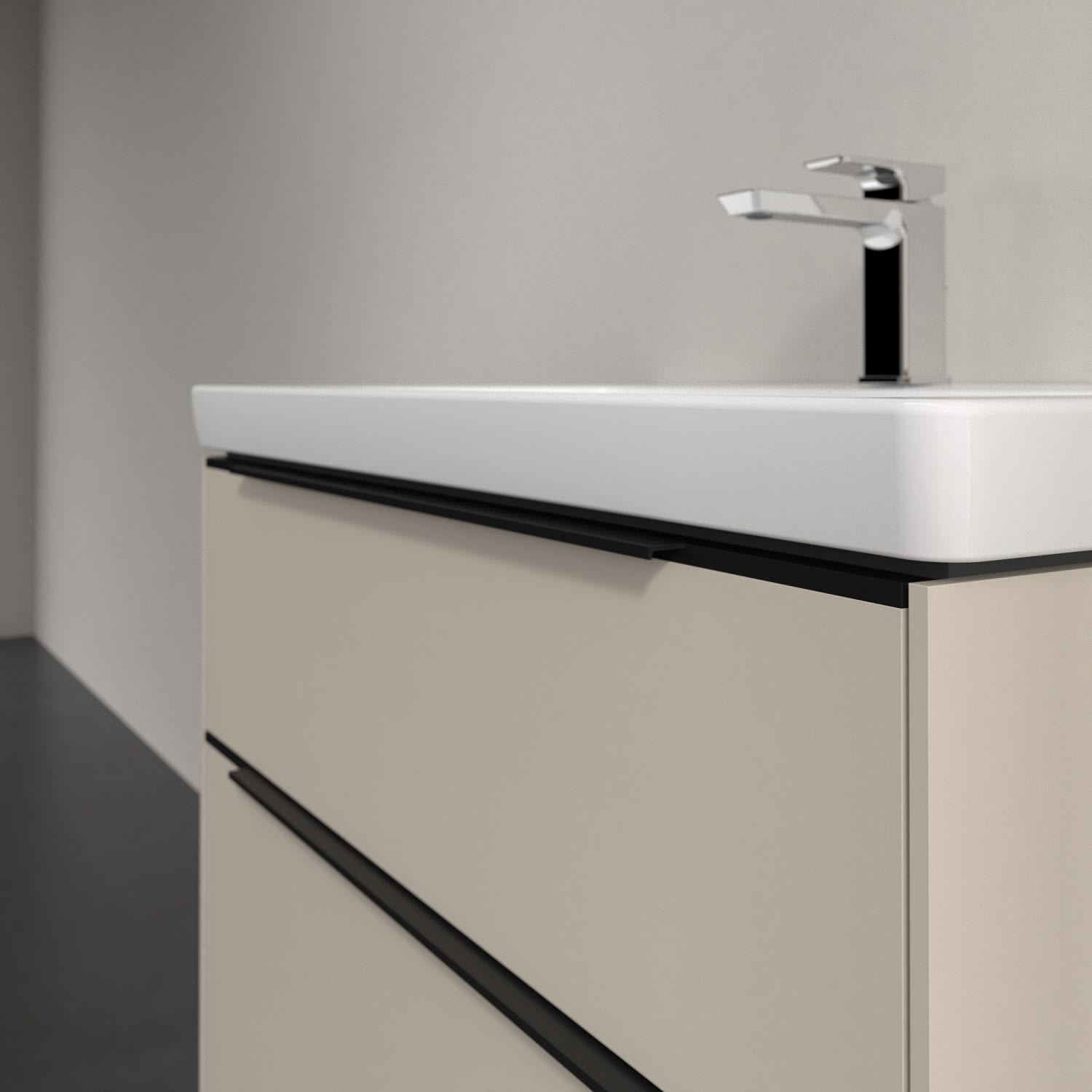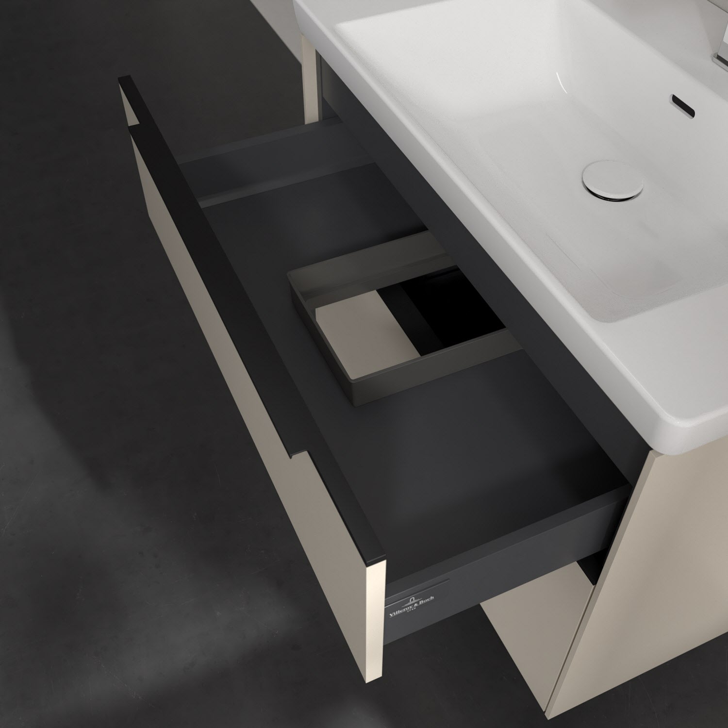 Der Waschtischunterschrank der Kollektion Subway 3.0 von Villeroy & Boch besticht durch gradliniges, zeitloses Design und großzügigen Stauraum. Front und Korpus sind mit einer hochwertigen Direktbeschichtung oder Lackierung, deren Anti-Fingerprint-Oberfläche unschönen Fingerabdrücken vorbeugt, versehen. Zwei voll ausziehbare Schubladen mit rutschhemmenden Böden, Selbsteinzug-Funktion sowie zwei integrierten kleinen Accessory-Boxen bieten extra viel Platz für Pflege- und Hygieneartikel. Die dezente Griffleiste sorgt für einfache Handhabung und bildet einen besonderen Design-Akzent.