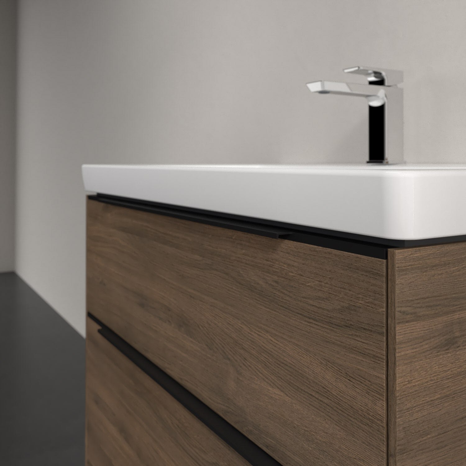 Der Waschtischunterschrank der Kollektion Subway 3.0 von Villeroy & Boch besticht durch gradliniges, zeitloses Design und großzügigen Stauraum. Front und Korpus sind mit einer hochwertigen Direktbeschichtung oder Lackierung, deren Anti-Fingerprint-Oberfläche unschönen Fingerabdrücken vorbeugt, versehen. Zwei voll ausziehbare Schubladen mit rutschhemmenden Böden, Selbsteinzug-Funktion sowie zwei integrierten kleinen Accessory-Boxen bieten extra viel Platz für Pflege- und Hygieneartikel. Die dezente Griffleiste sorgt für einfache Handhabung und bildet einen besonderen Design-Akzent.