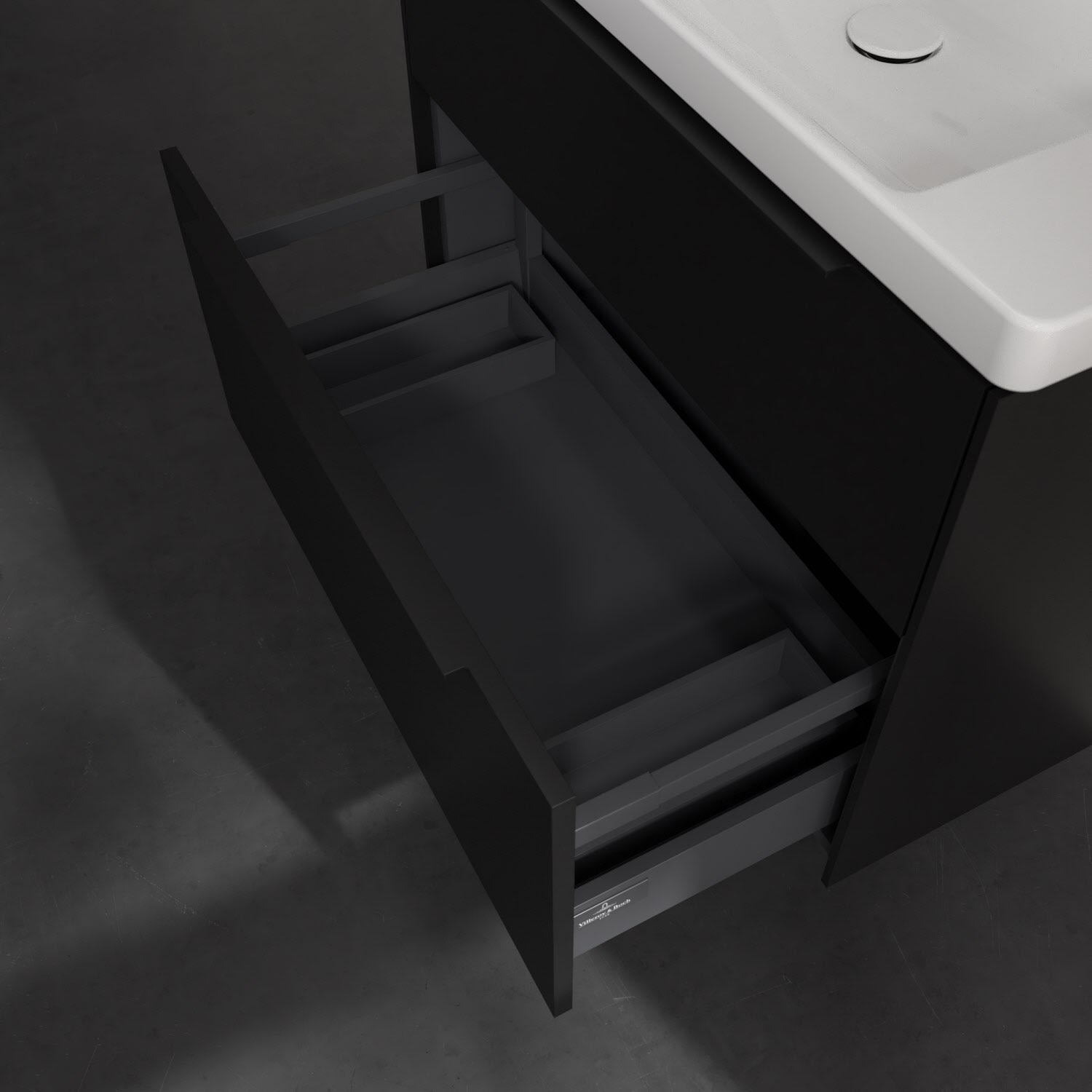 Der Waschtischunterschrank der Kollektion Subway 3.0 von Villeroy & Boch besticht durch gradliniges, zeitloses Design und großzügigen Stauraum. Front und Korpus sind mit einer hochwertigen Direktbeschichtung oder Lackierung, deren Anti-Fingerprint-Oberfläche unschönen Fingerabdrücken vorbeugt, versehen. Zwei voll ausziehbare Schubladen mit rutschhemmenden Böden, Selbsteinzug-Funktion sowie zwei integrierten kleinen Accessory-Boxen bieten extra viel Platz für Pflege- und Hygieneartikel. Die dezente Griffleiste sorgt für einfache Handhabung und bildet einen besonderen Design-Akzent.