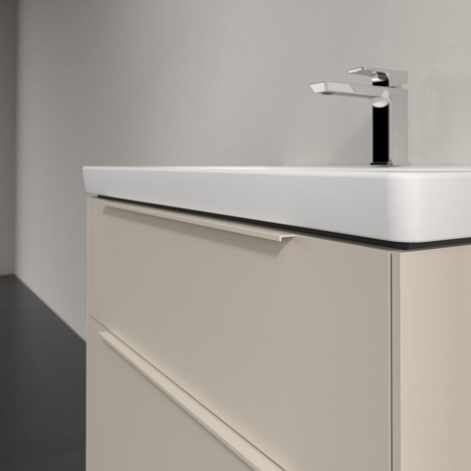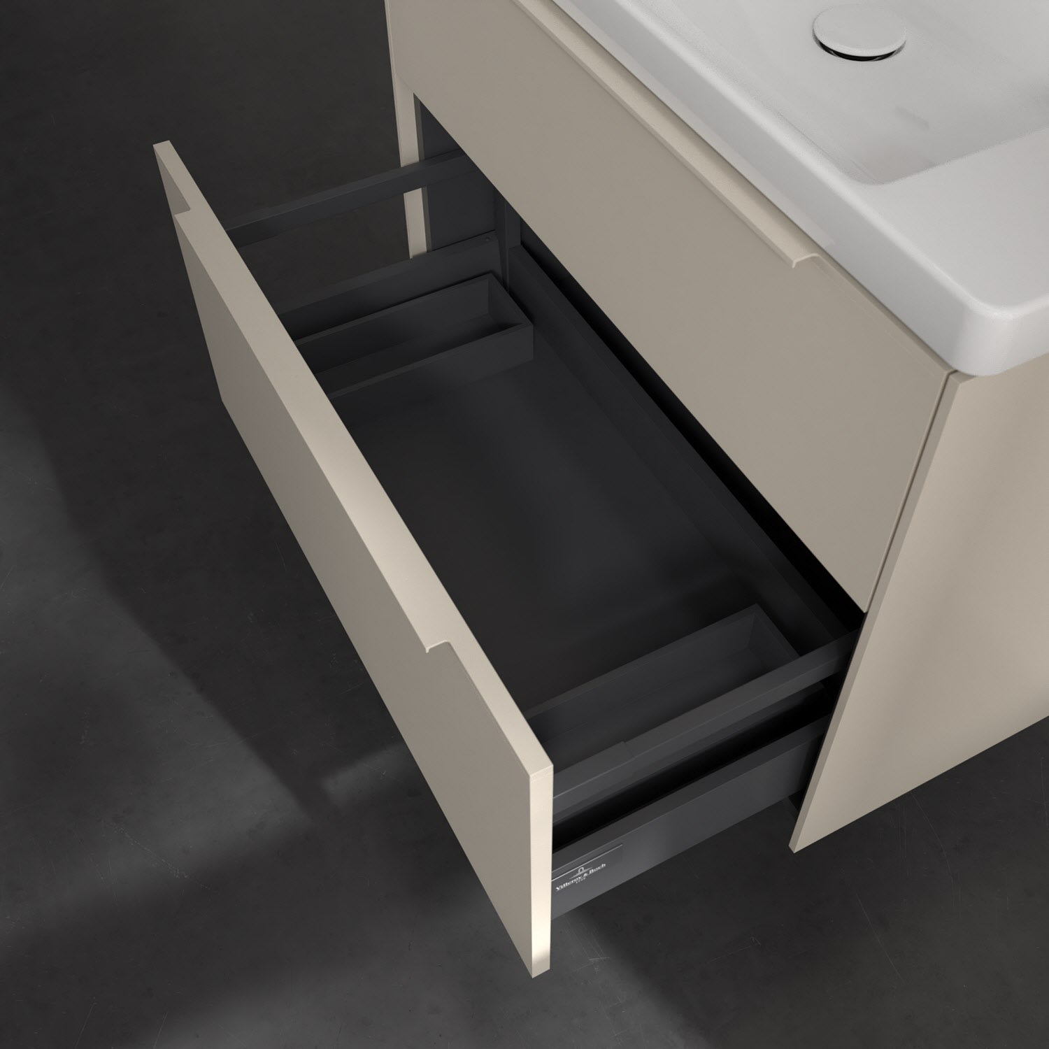 Der Waschtischunterschrank der Kollektion Subway 3.0 von Villeroy & Boch besticht durch gradliniges, zeitloses Design und großzügigen Stauraum. Front und Korpus sind mit einer hochwertigen Direktbeschichtung oder Lackierung, deren Anti-Fingerprint-Oberfläche unschönen Fingerabdrücken vorbeugt, versehen. Zwei voll ausziehbare Schubladen mit rutschhemmenden Böden, Selbsteinzug-Funktion sowie zwei integrierten kleinen Accessory-Boxen bieten extra viel Platz für Pflege- und Hygieneartikel. Die dezente Griffleiste sorgt für einfache Handhabung und bildet einen besonderen Design-Akzent.