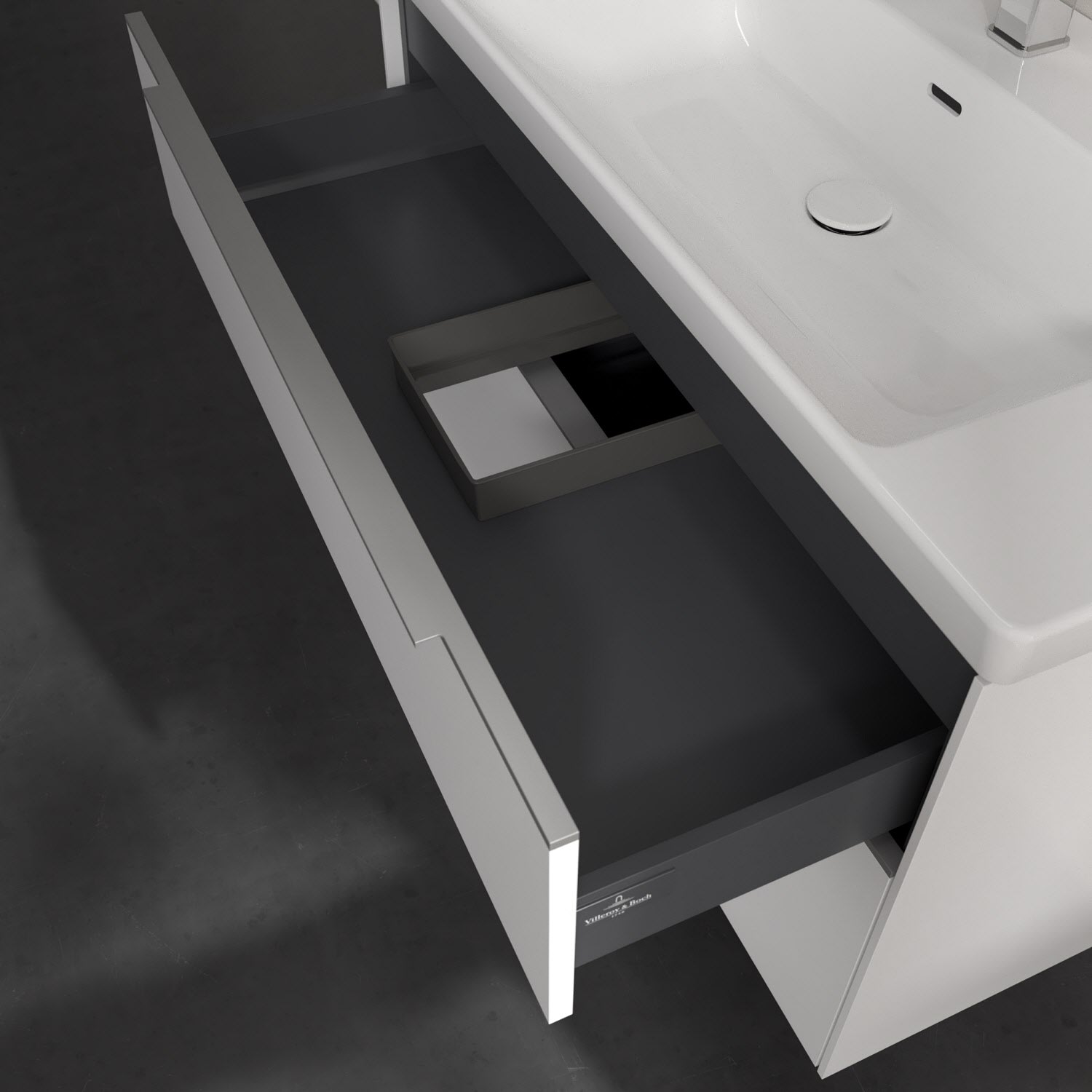 Der Waschtischunterschrank der Kollektion Subway 3.0 von Villeroy & Boch besticht durch gradliniges, zeitloses Design und großzügigen Stauraum. Front und Korpus sind mit einer hochwertigen Direktbeschichtung oder Lackierung, deren Anti-Fingerprint-Oberfläche unschönen Fingerabdrücken vorbeugt, versehen. Zwei voll ausziehbare Schubladen mit rutschhemmenden Böden, Selbsteinzug-Funktion sowie zwei integrierten kleinen Accessory-Boxen bieten extra viel Platz für Pflege- und Hygieneartikel. Die dezente Griffleiste sorgt für einfache Handhabung und bildet einen besonderen Design-Akzent.