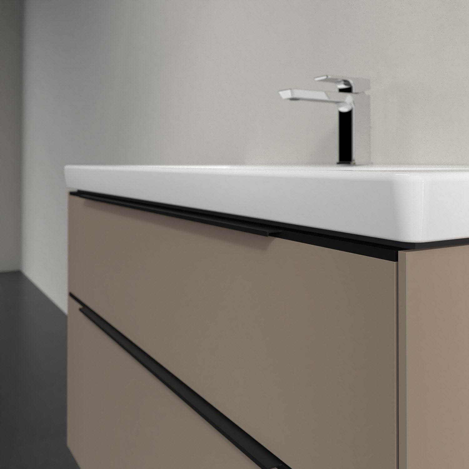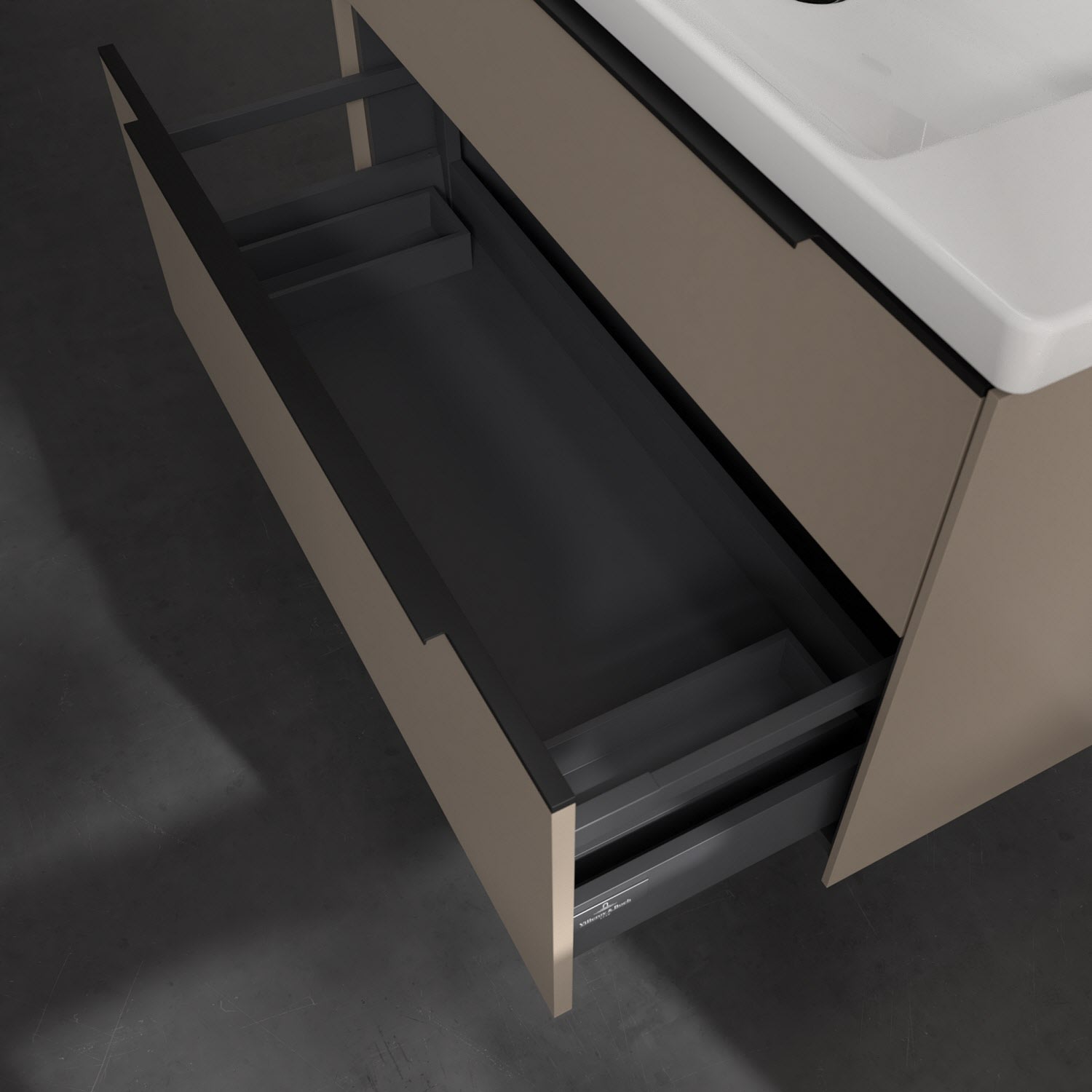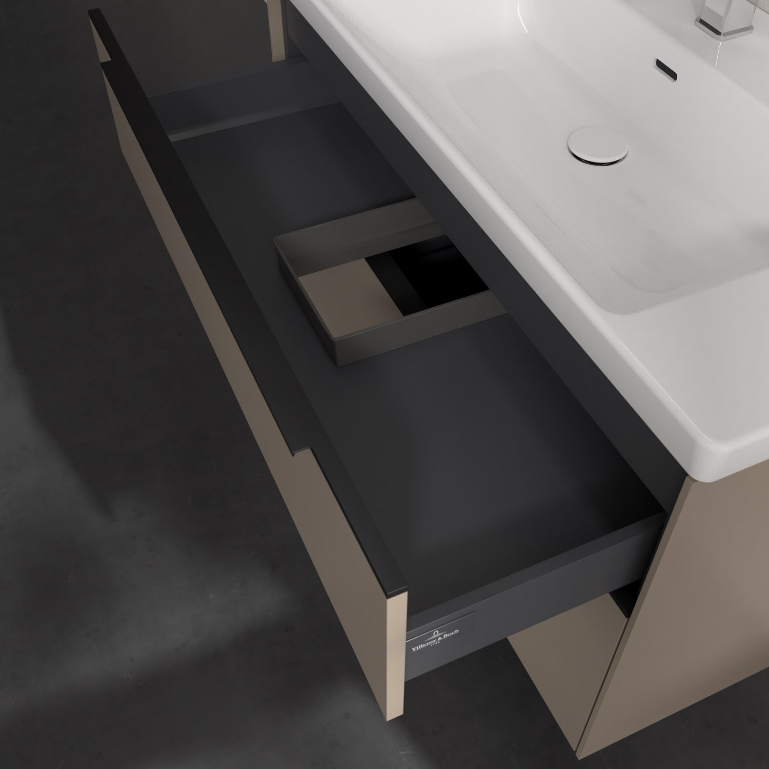 Der Waschtischunterschrank der Kollektion Subway 3.0 von Villeroy & Boch besticht durch gradliniges, zeitloses Design und großzügigen Stauraum. Front und Korpus sind mit einer hochwertigen Direktbeschichtung oder Lackierung, deren Anti-Fingerprint-Oberfläche unschönen Fingerabdrücken vorbeugt, versehen. Zwei voll ausziehbare Schubladen mit rutschhemmenden Böden, Selbsteinzug-Funktion sowie zwei integrierten kleinen Accessory-Boxen bieten extra viel Platz für Pflege- und Hygieneartikel. Die dezente Griffleiste sorgt für einfache Handhabung und bildet einen besonderen Design-Akzent.