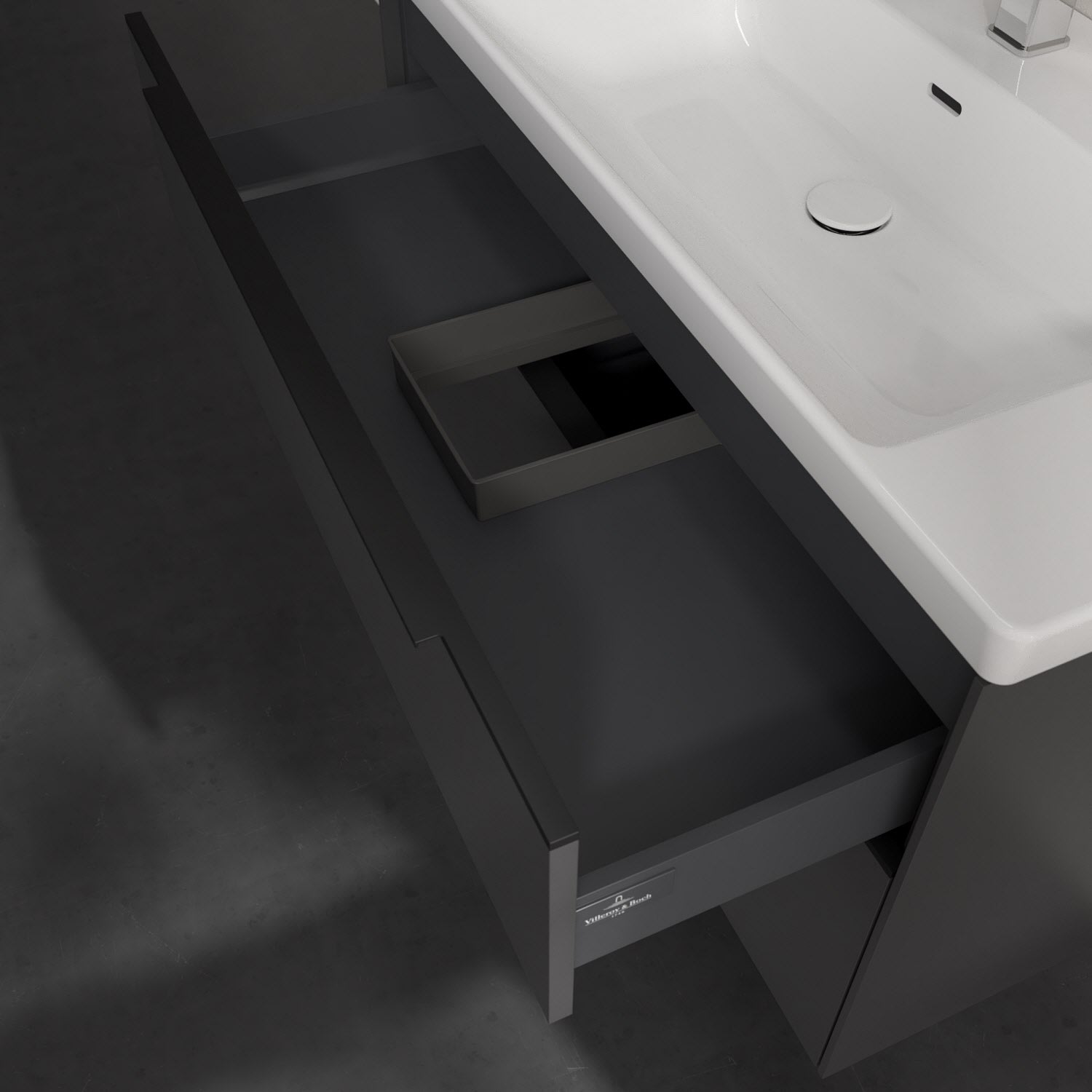 Der Waschtischunterschrank der Kollektion Subway 3.0 von Villeroy & Boch besticht durch gradliniges, zeitloses Design und großzügigen Stauraum. Front und Korpus sind mit einer hochwertigen Direktbeschichtung oder Lackierung, deren Anti-Fingerprint-Oberfläche unschönen Fingerabdrücken vorbeugt, versehen. Zwei voll ausziehbare Schubladen mit rutschhemmenden Böden, Selbsteinzug-Funktion sowie zwei integrierten kleinen Accessory-Boxen bieten extra viel Platz für Pflege- und Hygieneartikel. Die dezente Griffleiste sorgt für einfache Handhabung und bildet einen besonderen Design-Akzent.