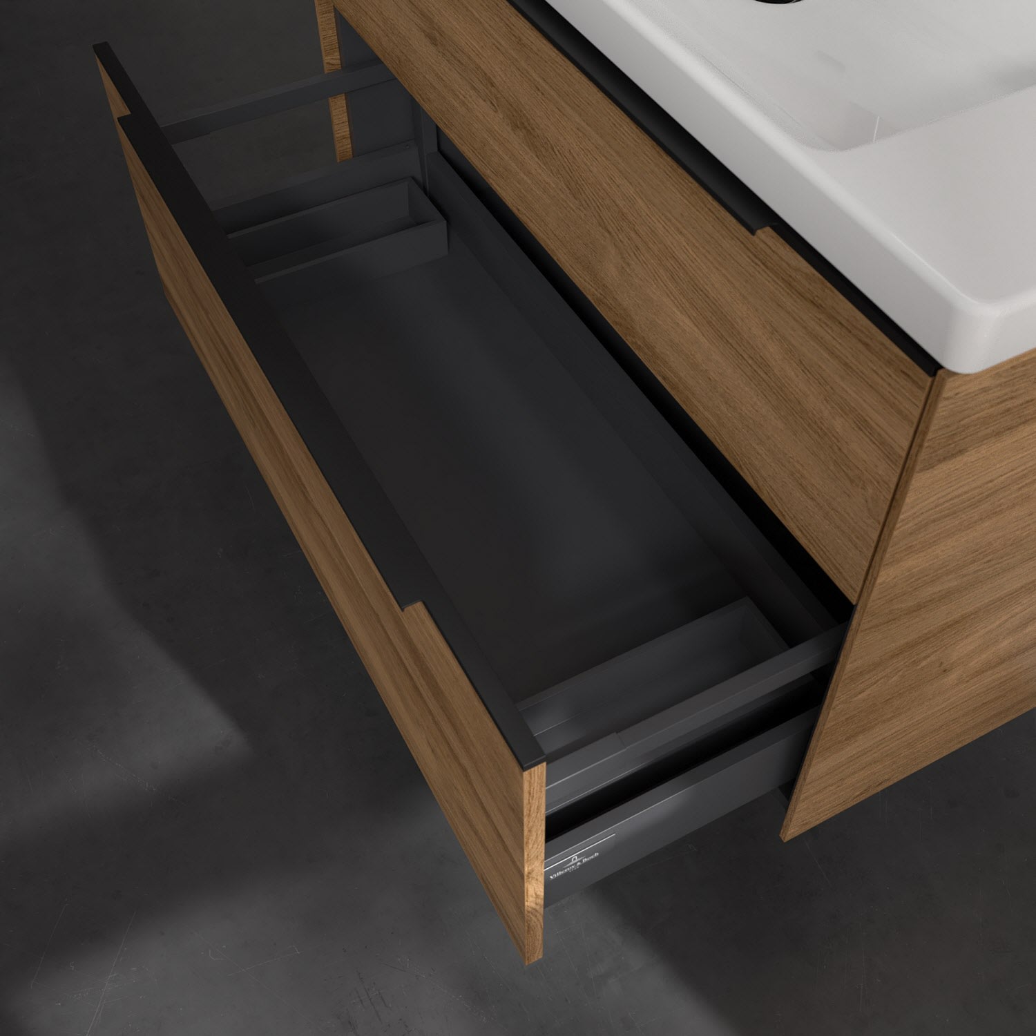 Der Waschtischunterschrank der Kollektion Subway 3.0 von Villeroy & Boch besticht durch gradliniges, zeitloses Design und großzügigen Stauraum. Front und Korpus sind mit einer hochwertigen Direktbeschichtung oder Lackierung, deren Anti-Fingerprint-Oberfläche unschönen Fingerabdrücken vorbeugt, versehen. Zwei voll ausziehbare Schubladen mit rutschhemmenden Böden, Selbsteinzug-Funktion sowie zwei integrierten kleinen Accessory-Boxen bieten extra viel Platz für Pflege- und Hygieneartikel. Die dezente Griffleiste sorgt für einfache Handhabung und bildet einen besonderen Design-Akzent.